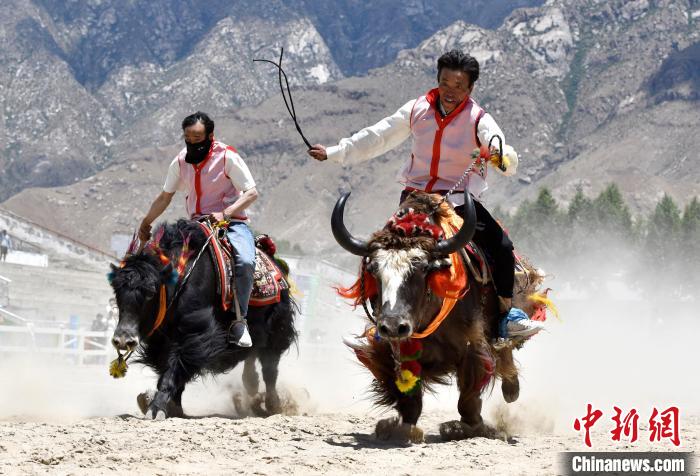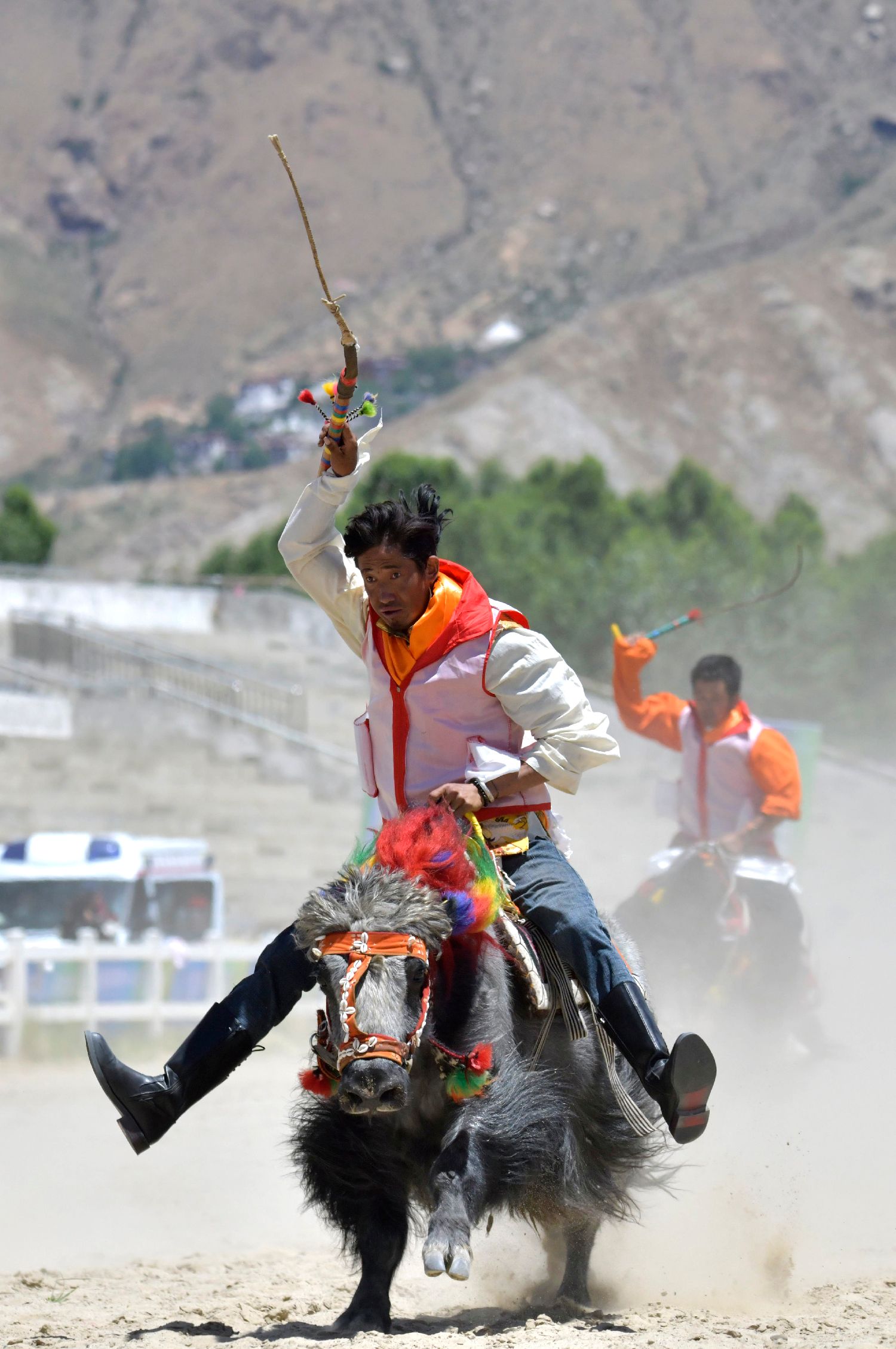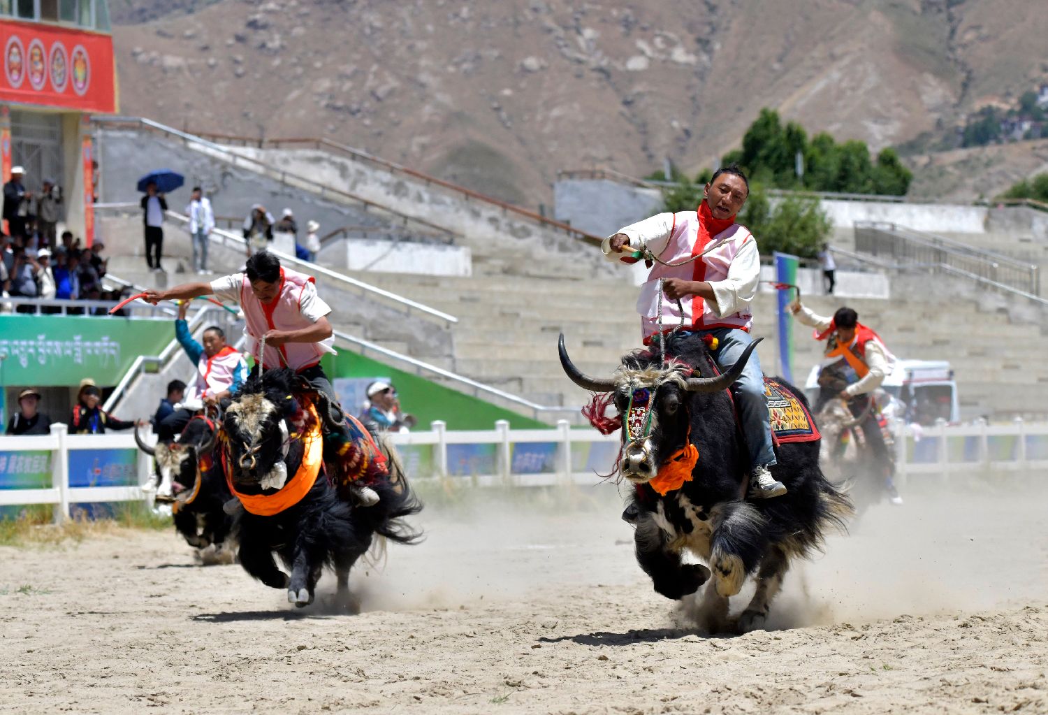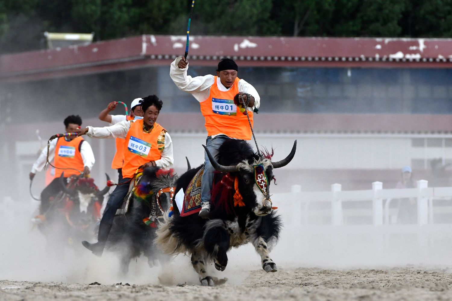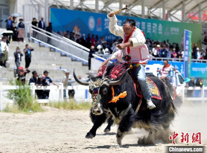 牦牛被誉为“高原之舟”,赛牦牛是中国藏族的传统体育项目。6月23日,在拉萨首届农牧民运动会上的赛牦牛比赛中,骑手们驱牛疾驰。图为当日,在拉萨首届农牧民运动会上的赛牦牛决赛比赛现场。中新社