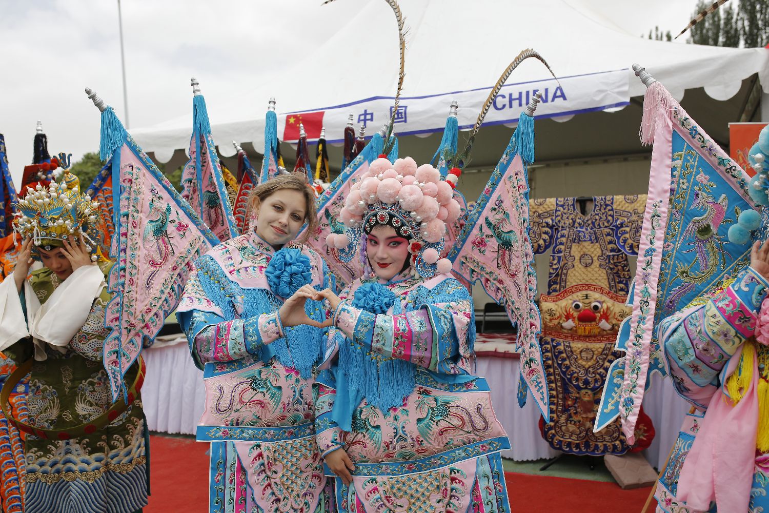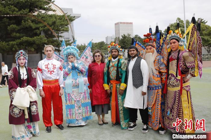 6月23日,内蒙古师范大学首届国际文化节在中国内蒙古自治区呼和浩特市举办,来自蒙古国、俄罗斯、韩国、巴基斯坦、老挝等12个国家的251名留学生在校园里结伴、交友。他们有的摆摊制作售卖本国美食,有的设展展示本国文化,有的身着中国戏曲服装体验中华传统文化……现场热闹非凡。图为当日,俄罗斯留学生身着中国戏曲服装与演员合影。中新社