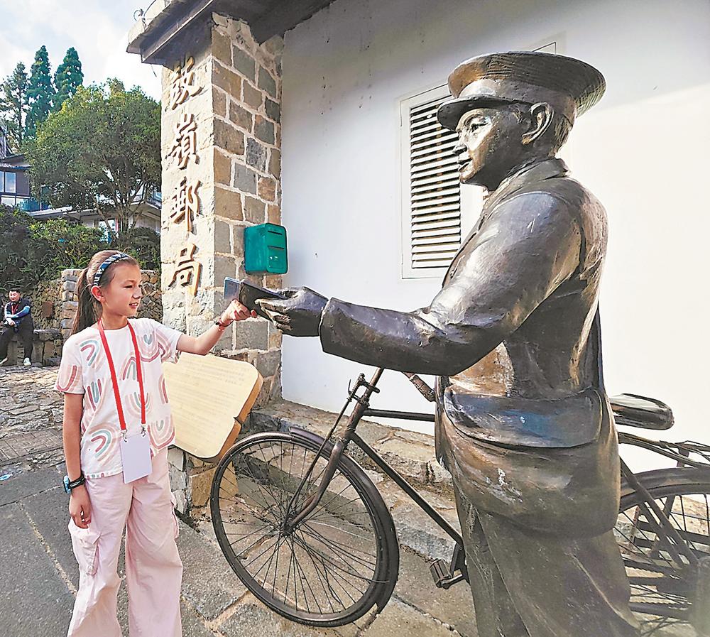 一名参加活动的小朋友被鼓岭邮局前的雕像吸引。《福建日报》