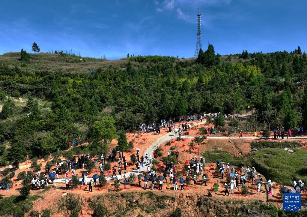 24日,参加2024“鼓岭缘”中美青年交流周的中外嘉宾们共植友谊树(无人机照片)。新华社