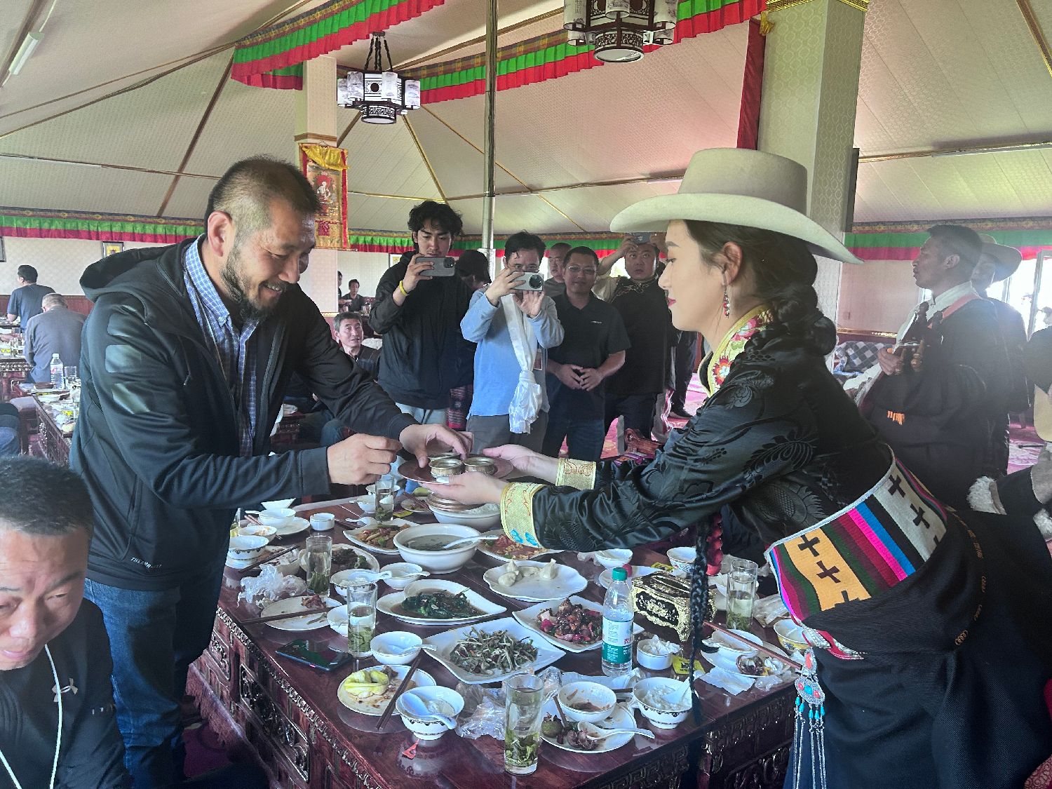 藏族人在敬酒时一般用青稞酒,客人须用小指沾酒对空弹三下,然后啜三口,每喝一口主人都要斟酒,最后再喝干,称为“三口一杯”,是藏族最正规的饮酒礼节,经过“三口一杯”后,才可以开始畅饮。图为藏族民众向华媒代表敬酒。门凌霄摄