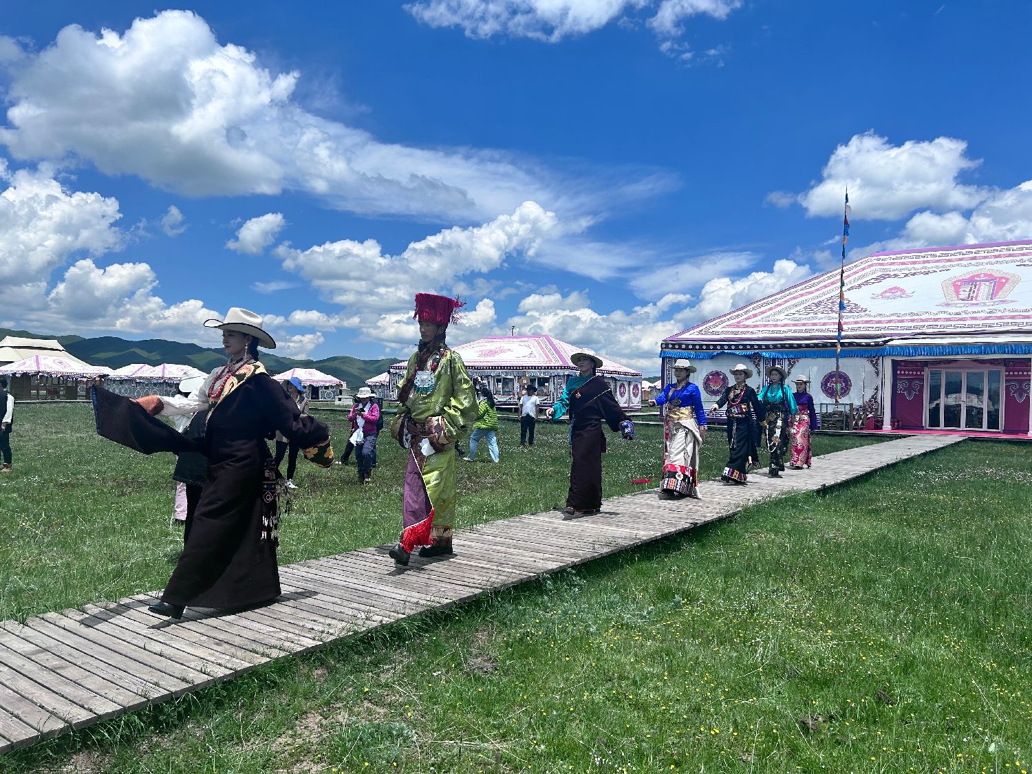 在帐篷城内,藏族民众载歌载舞,欢迎远道而来的客人。碌曲藏族服饰在县域内有很大差异,外观因性别、年龄、地位、身份、气候而有所不同,但其共同点就是广泛吸取了多种文化元素。图为碌曲藏族服饰展演。门凌霄摄