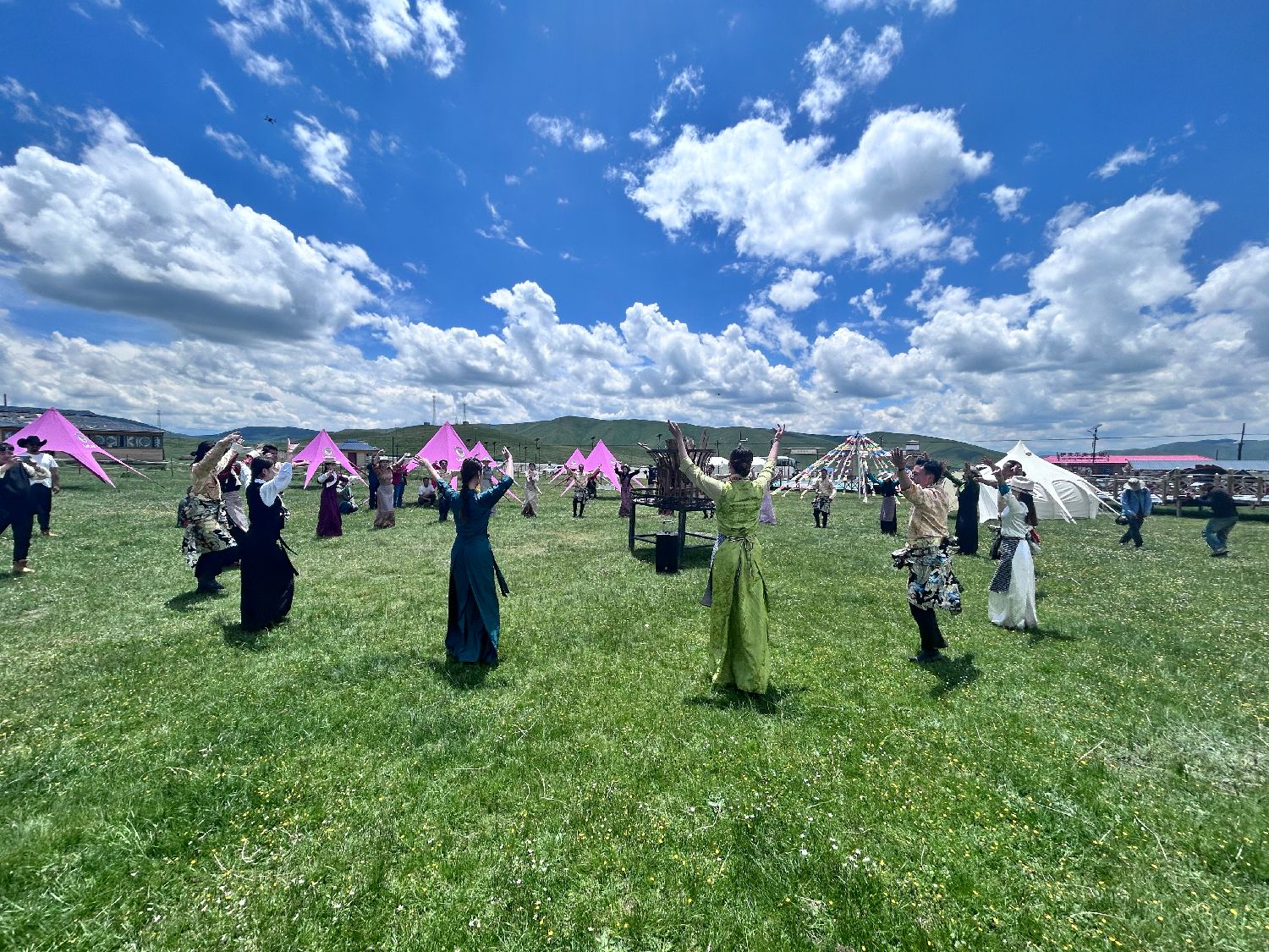 除藏族服饰“走秀”外,藏族民众还为华媒代表和游客带来热情的藏族舞蹈。图为传统舞蹈锅庄舞,期间有华媒代表加入其中,与藏族民众一同起舞。门凌霄摄