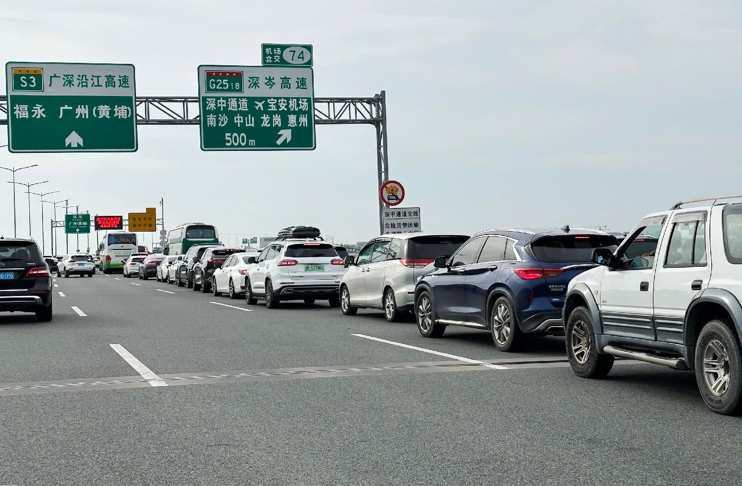 6月30日,大批车辆早早等候在深中通道中山翠亨东收费站外等待通车。新华社