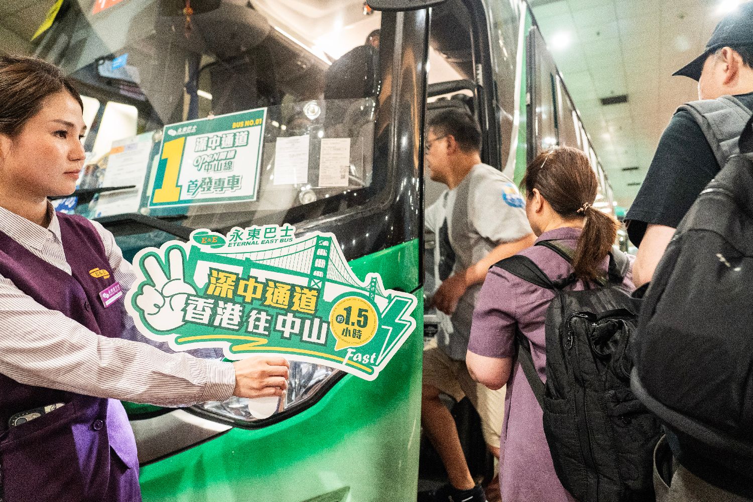 6月30日,深中通道正式开通,香港一家跨境巴士运营公司随之开通从香港前往广东省中山市的巴士线路,市民游客前往大陆城市的交通更加便利。图为工作人员引导市民游客登车。中新社