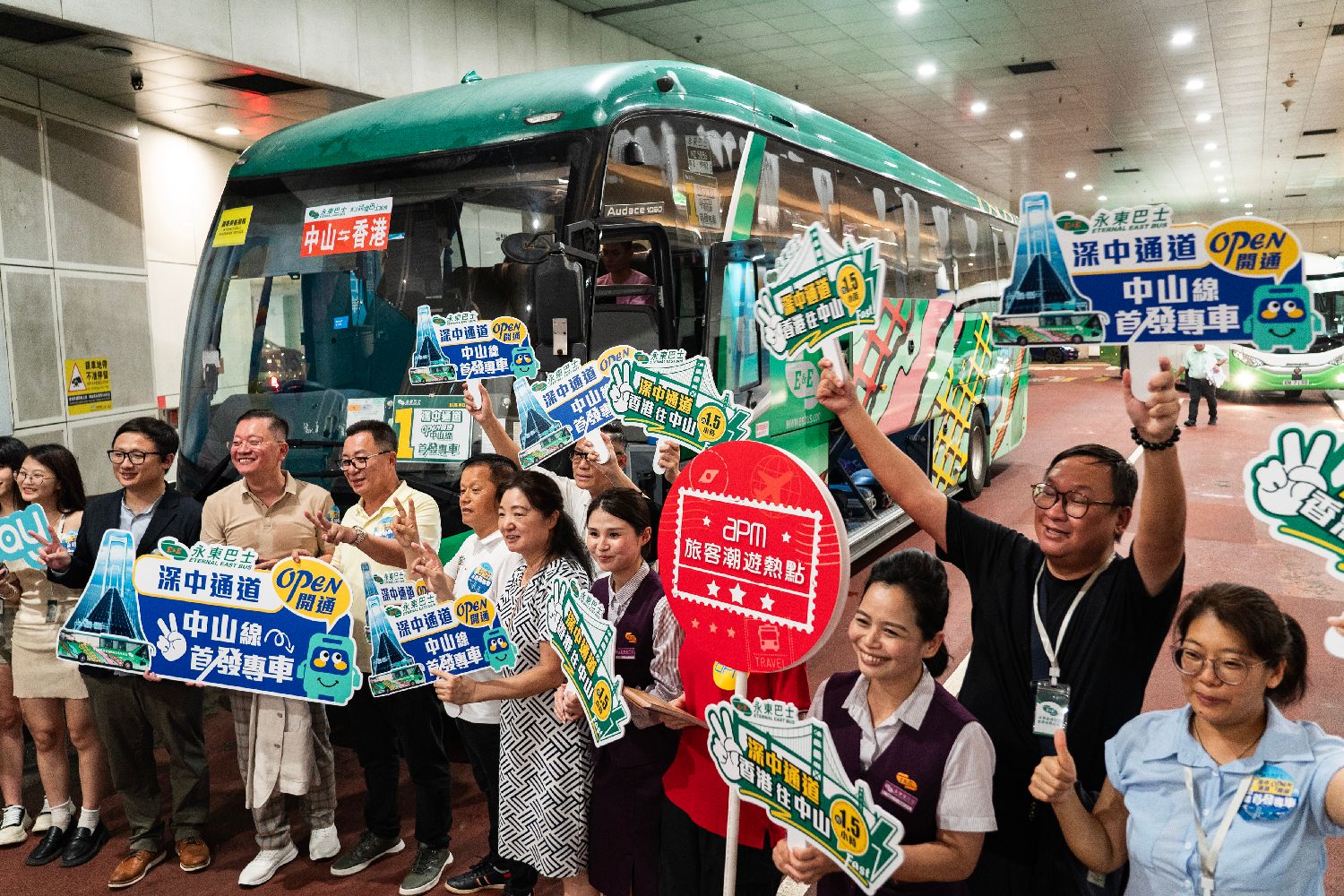 6月30日,香港一家跨境巴士运营公司工作人员和首批乘客代表在发车前集体合影。中新社