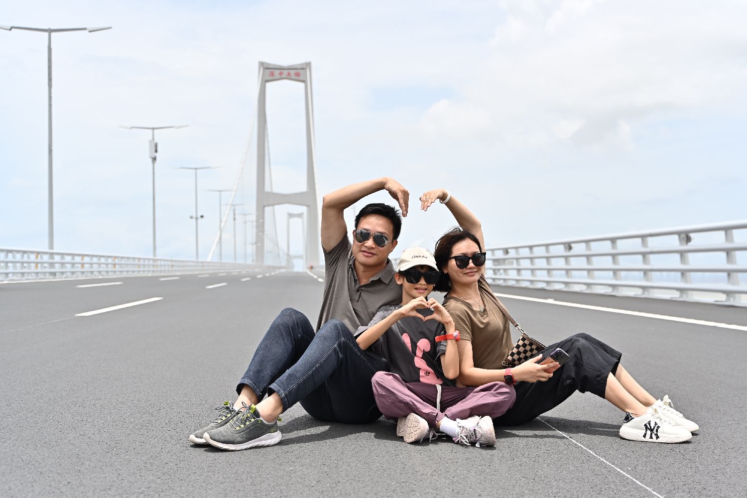 6月30日,建设者及家属在深中大桥上留影。中新社