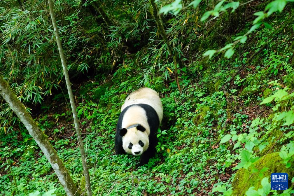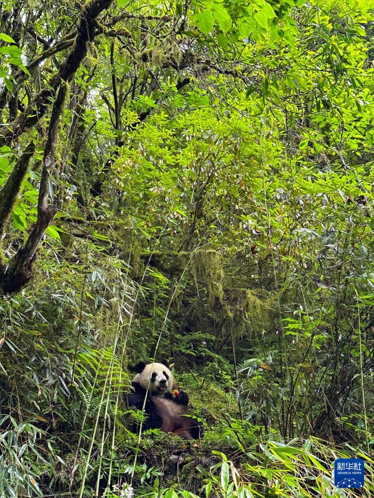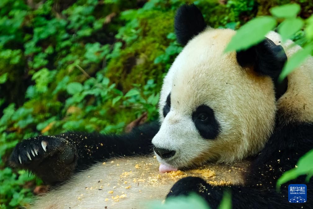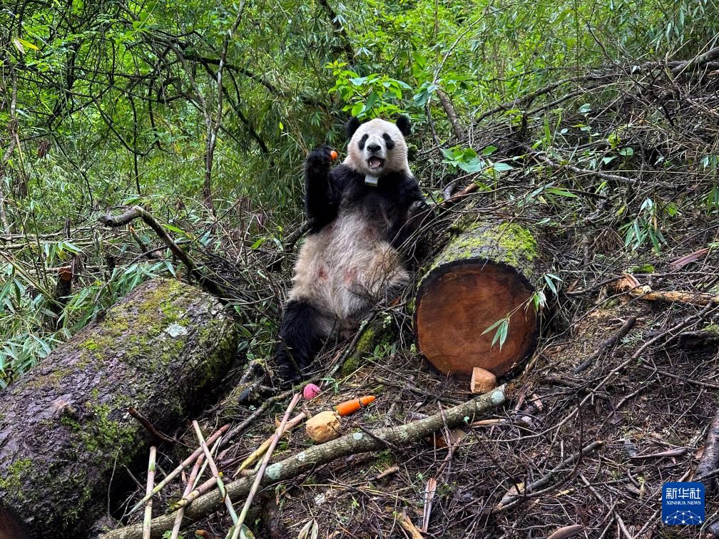近年来,中国通过大力实施天然林保护、野生动植物保护和大熊猫国家公园建设等,保护大熊猫及其栖息地,成效显著。大熊猫野外种群总量已从20世纪80年代的约1100只增长到近1900只。将圈养繁育大熊猫经过野化培训后放归到野外濒危小种群中,从而改善小种群遗传多样性、降低其灭绝风险,实现野生大熊猫种群的恢复壮大和重建,对保护大熊猫具有重要意义。图为在位于中国大熊猫国家公园卧龙片区内天台山的大熊猫第二阶段野化培训场内,母熊猫“贤贤”在吃工作人员投喂的窝窝头(6月24日摄)。