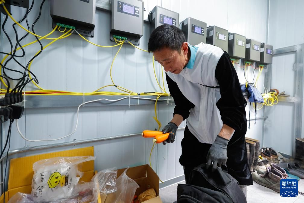 在卧龙片区内的大熊猫第二阶段野化培训天台山工作站,工作人员牟仕杰穿上“熊猫服”,带上胡萝卜,准备去巡护大熊猫野化培训场,并给母熊猫“辉辉”和“贤贤”投喂食物(6月24日摄)。