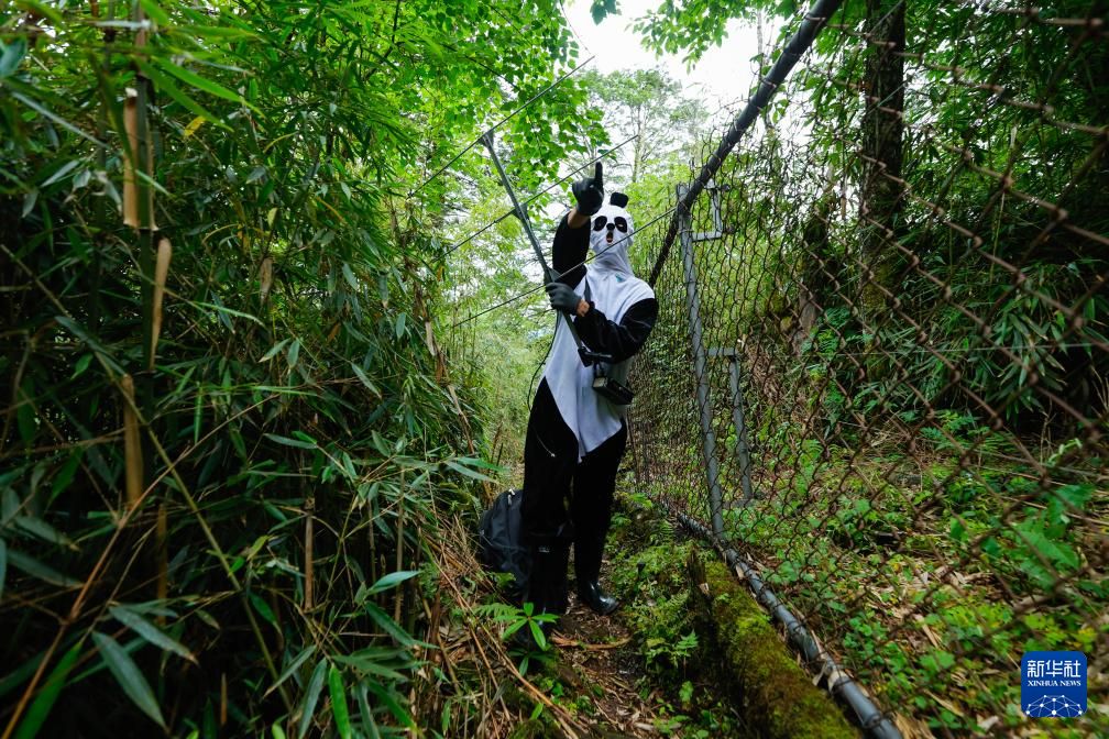 工作人员牟仕杰身穿“熊猫服”,用无线电定位设备搜寻到较强的信号,表明附近有大熊猫(6月24日摄)。每次给母熊猫投喂食物的时候,工作人员都会穿上“熊猫服”,避免幼仔对人类产生依赖。为了掩盖人类的气味,“熊猫服”上喷有熊猫粪便和尿液的提取物。