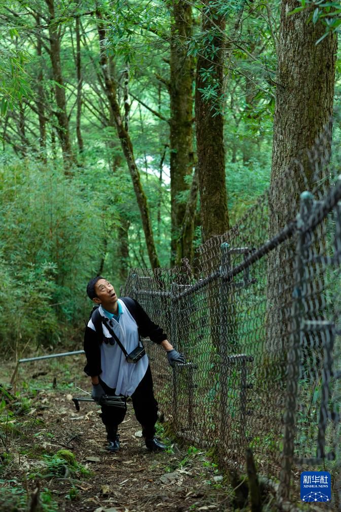 在位于中国大熊猫国家公园卧龙片区内的天台山,工作人员牟仕杰身穿“熊猫服”巡护大熊猫第二阶段野化培训场时,抬头观察树上是否有大熊猫幼仔(6月24日摄)。