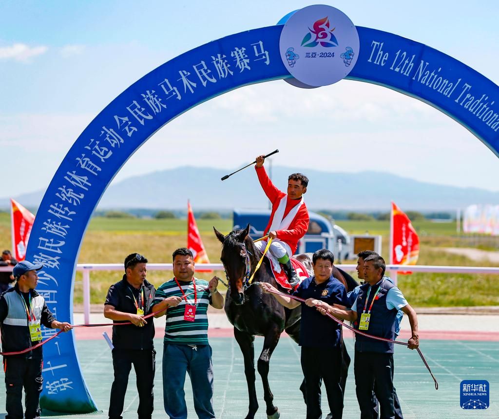 西藏代表队运动员扎西平措(上)和赛马“和力雄鹰”在获得民族赛马2000米比赛冠军后庆祝。他们以2分24秒68的成绩夺冠。新华社