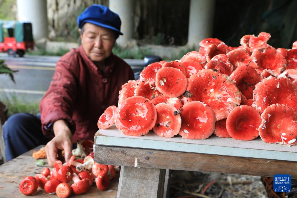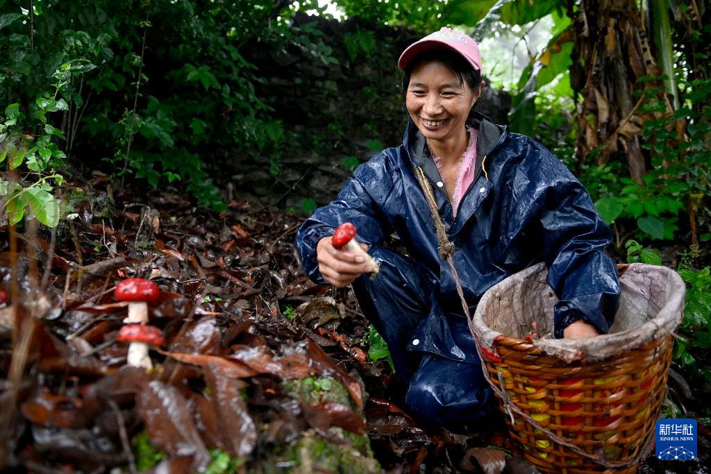 7月2日,云南省大理白族自治州南涧彝族自治县公郎镇村民在采摘大红菌。