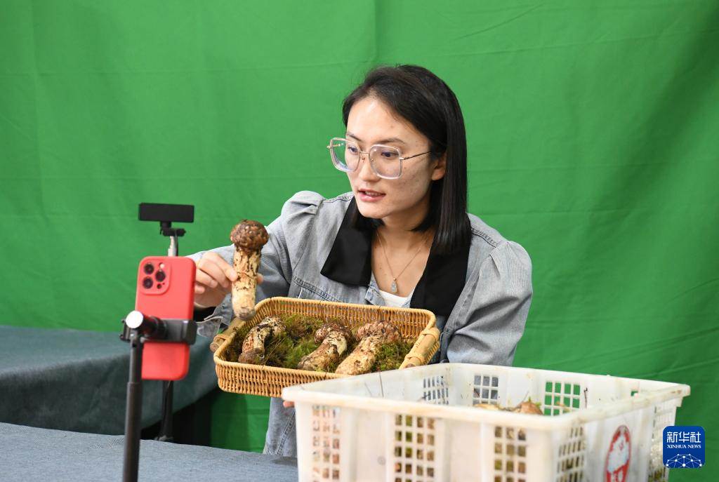 7月5日,工作人员在云南省丽江市松茸交易中心直播带货松茸。