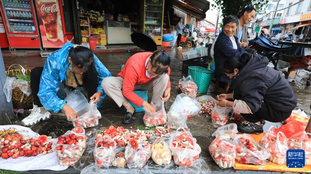 6月28日,在云南腾冲市猴桥镇箐口村野生食用菌交易市场,当地村民分拣、出售新鲜采拾的大红菌。
