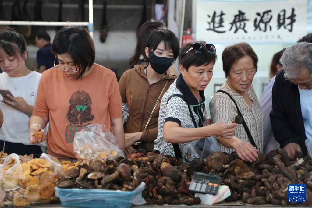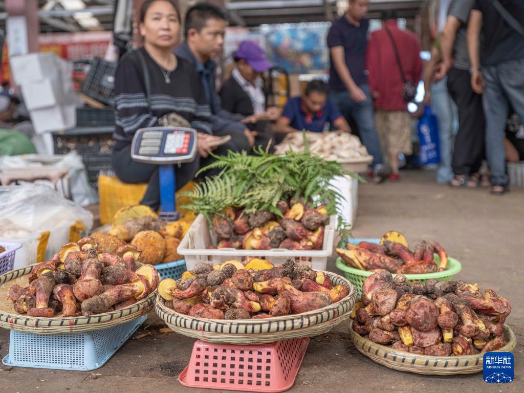 6月29日,人们在云南省红河哈尼族彝族自治州蒙自市起龙农副产品交易中心野生菌交易区选购菌子。