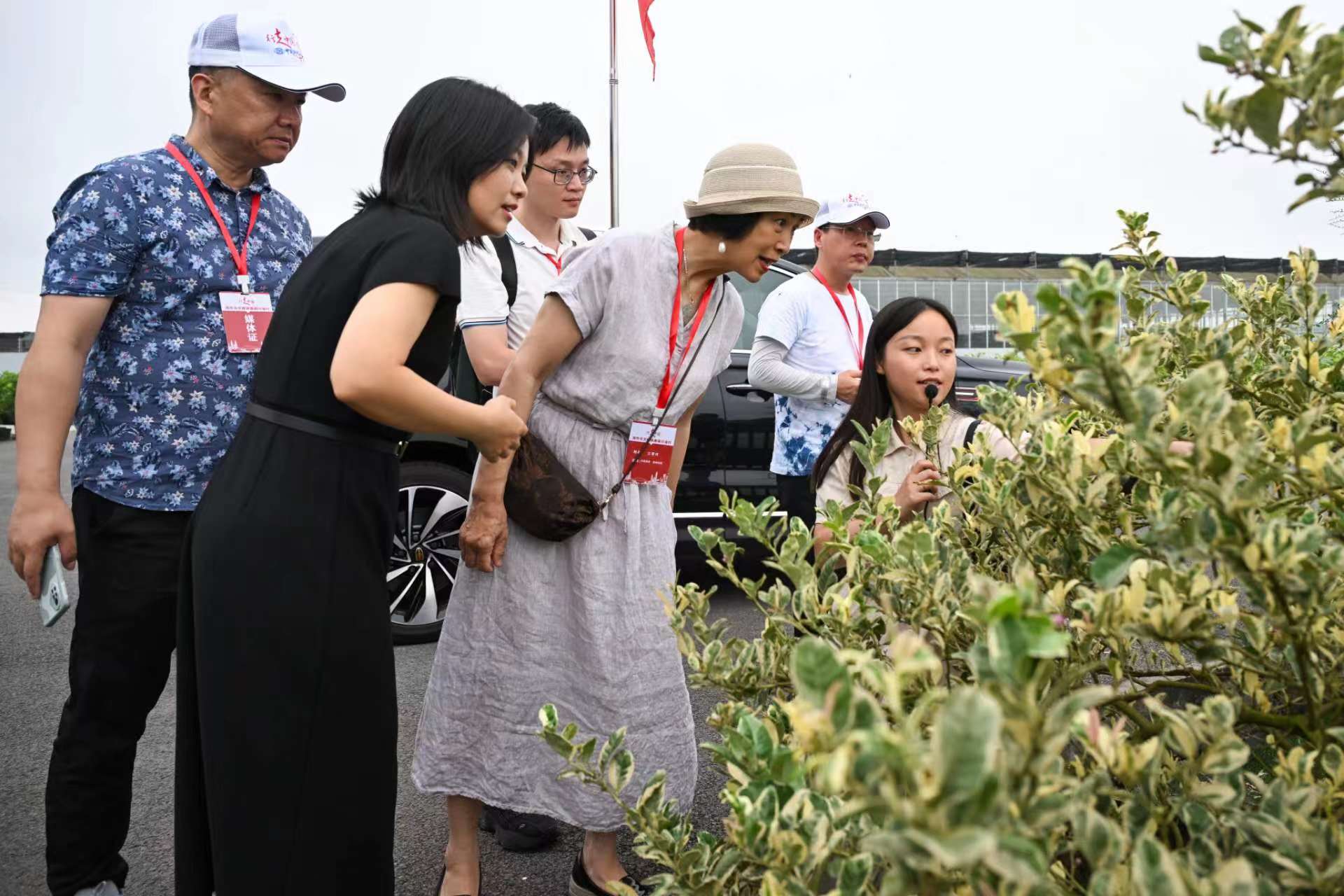 华文媒体代表在重庆潼南种苗繁育中心聆听讲解员介绍斑叶柠檬品种。肖怡然摄