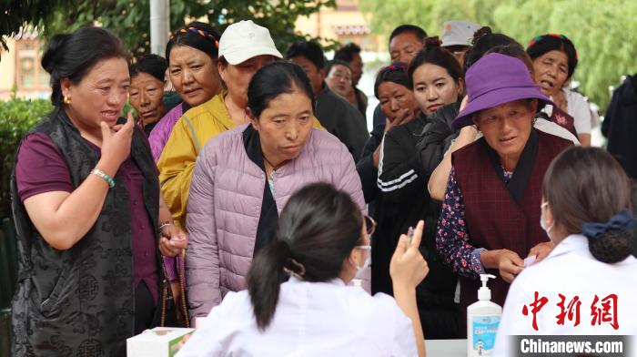 7月9日,民众在巴塘县人民医院义诊分诊台排队候诊。中新网