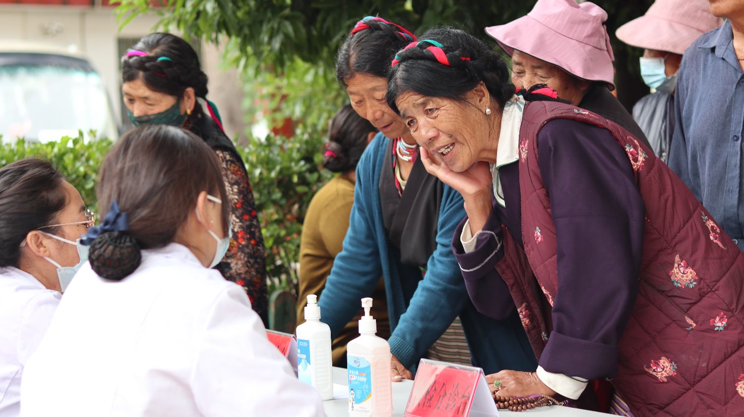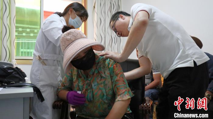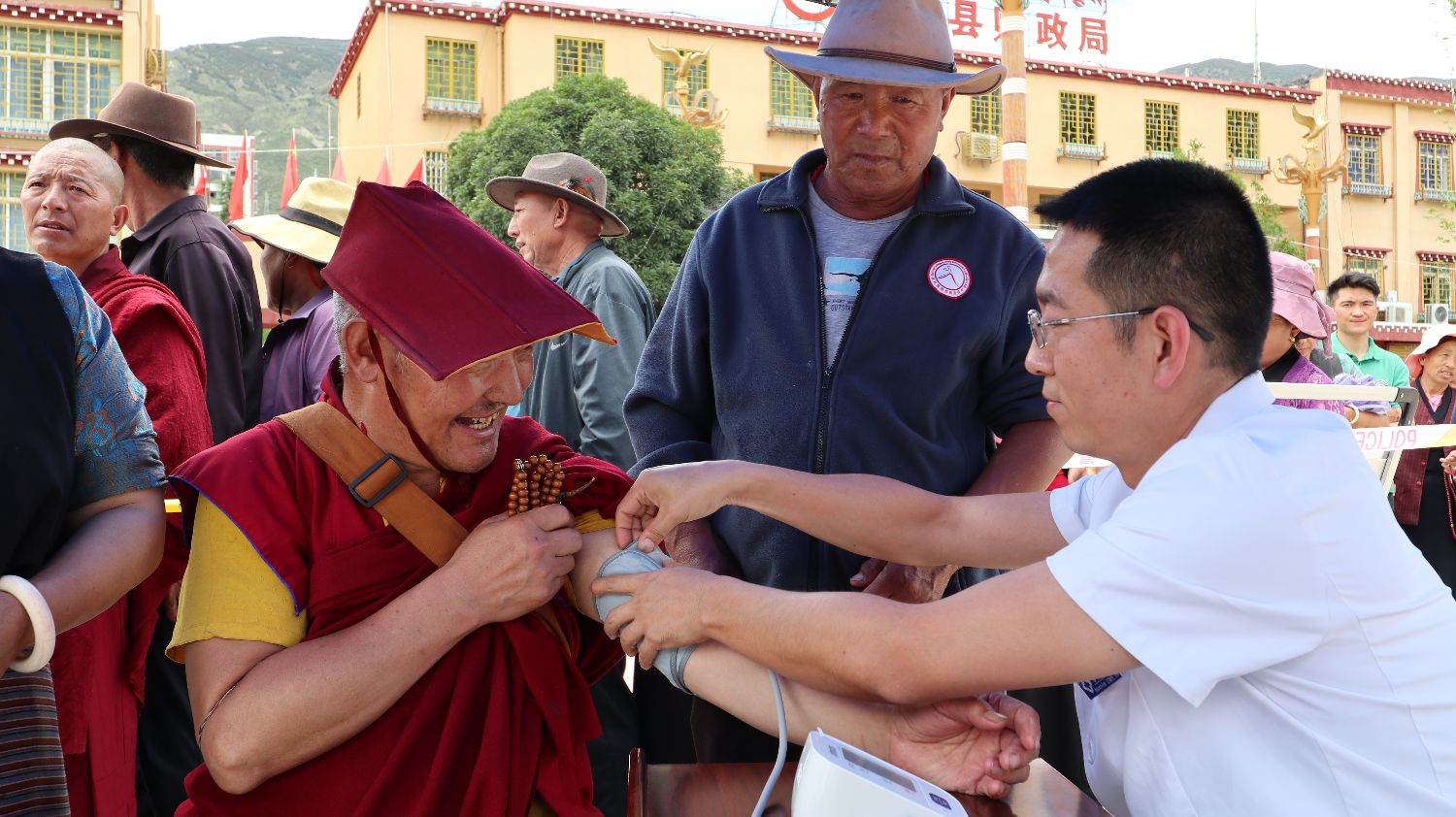 7月8日,医疗专家在巴塘县中山广场为民众测量血压。中新社