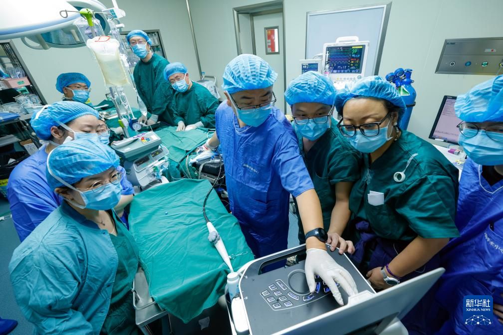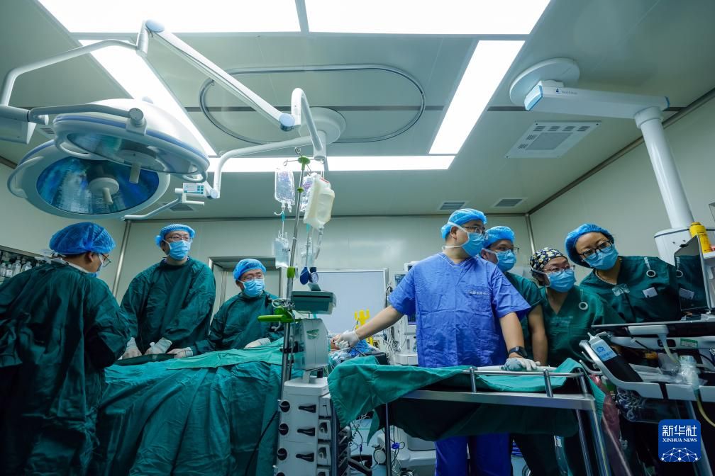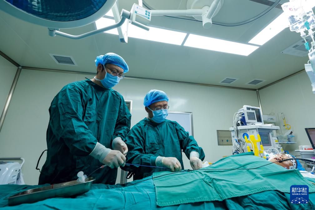 7月8日,在四川省甘孜藏族自治州人民医院,“同心·共铸中国心”医务志愿者、中国工程院院士、清华大学附属北京清华长庚医院院长董家鸿教授(左)为一名患有肝包虫病的藏族女孩实施手术。新华社