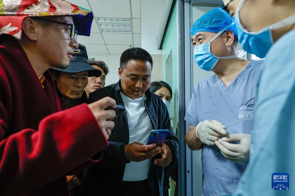7月8日,在四川省甘孜藏族自治州人民医院,“同心·共铸中国心”医务志愿者、中国工程院院士、清华大学附属北京清华长庚医院院长董家鸿教授(右二)为一名患有肝包虫病的藏族女孩成功实施手术后,与患儿家属交流手术情况。新华社