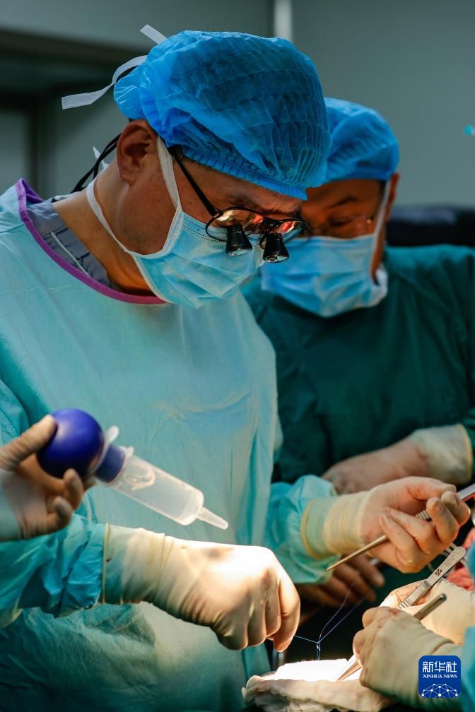 7月9日,在四川省甘孜藏族自治州人民医院,“同心·共铸中国心”医务志愿者、清华大学第一附属医院心脏外科副主任医师薛辉为一名患有先天性心脏病的藏族男孩实施手术。新华社