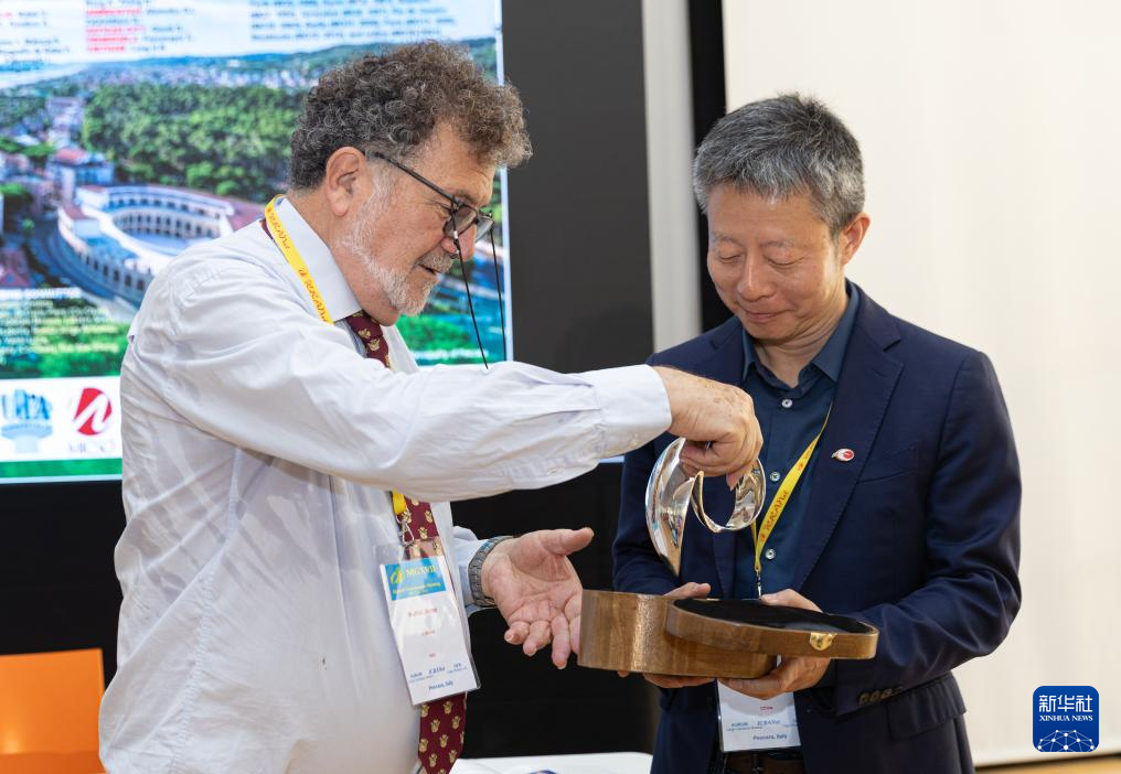 7月9日,在意大利佩斯卡拉,会议主办方之一、国际相对论天体物理中心网络主任雷莫·鲁菲尼(左)为李菂颁奖。
