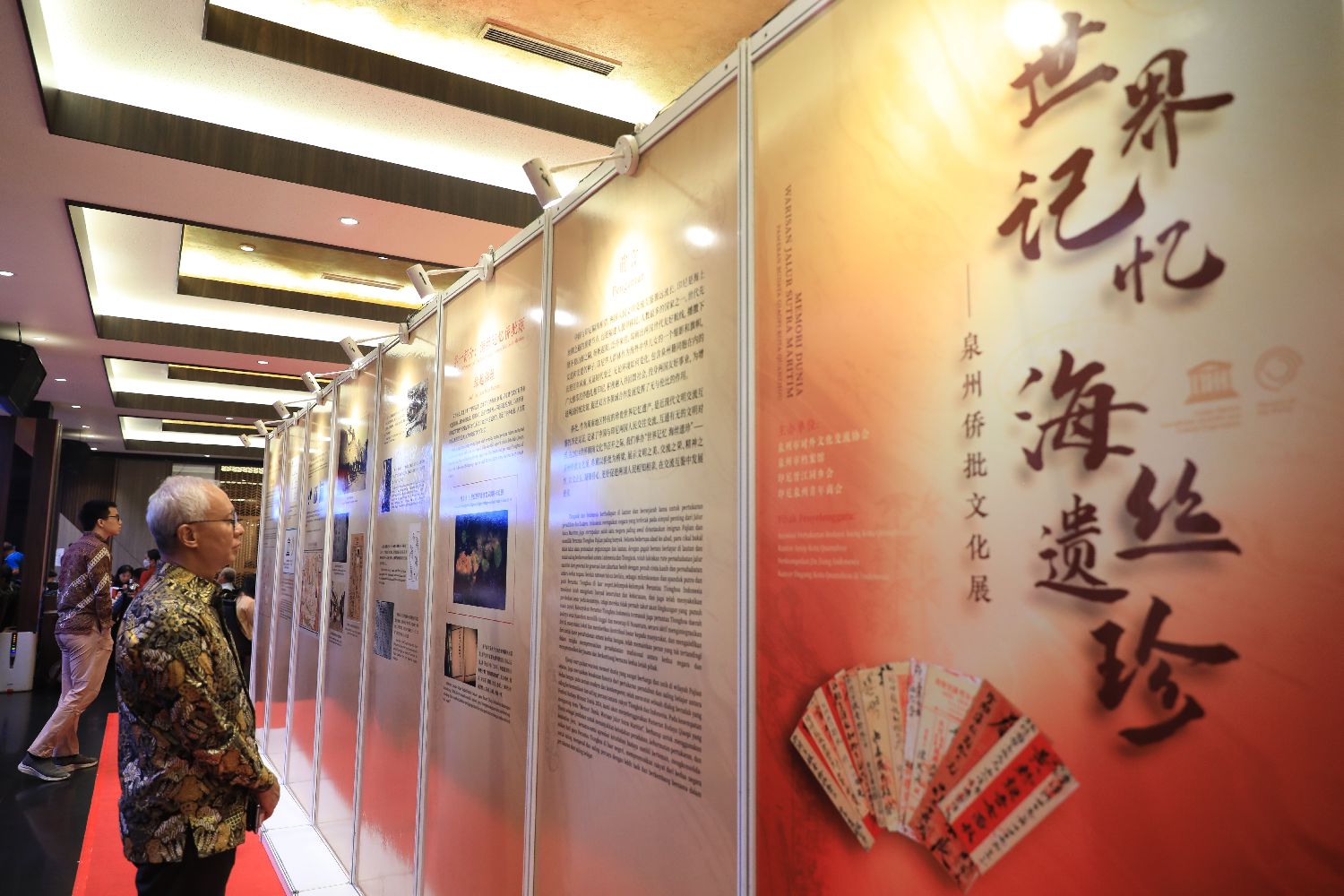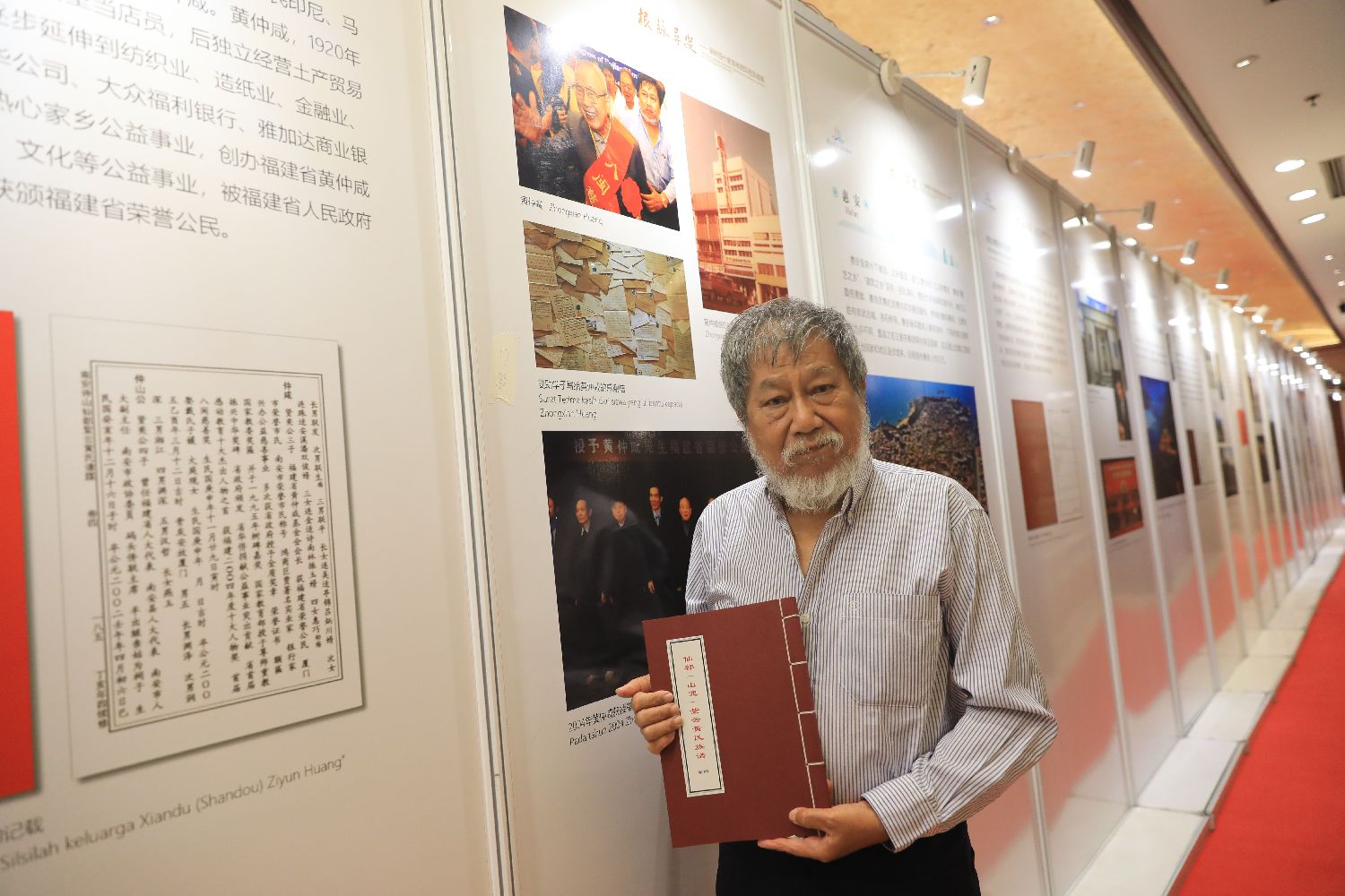 当地时间7月11日,“海丝泉州走进千岛之国”活动在印度尼西亚雅加达举行。泉州是海上丝绸之路的重要节点城市,“千岛之国”印尼是海外泉籍华侨华人的重要聚居地之一。图为“根脉寻踪”族谱展前,印尼华人黄湘江手持黄氏族谱。他背后的展览是介绍其父亲、已故印尼著名华人企业家、慈善家黄仲咸热心家乡公益事业的内容。中新社