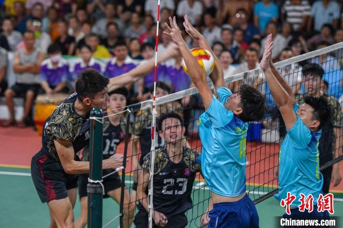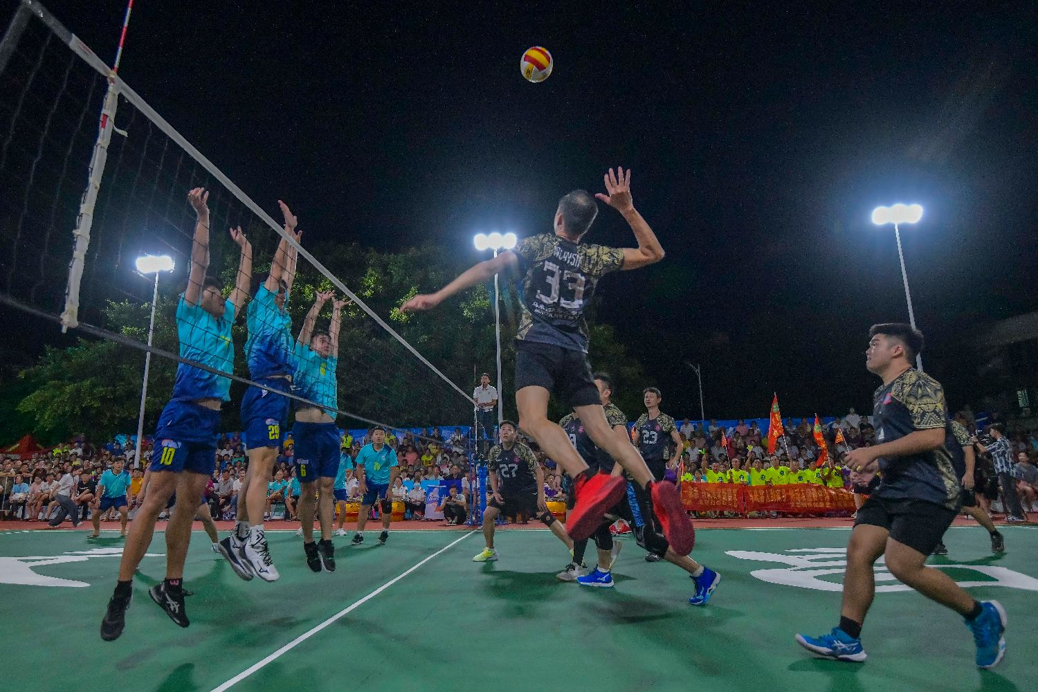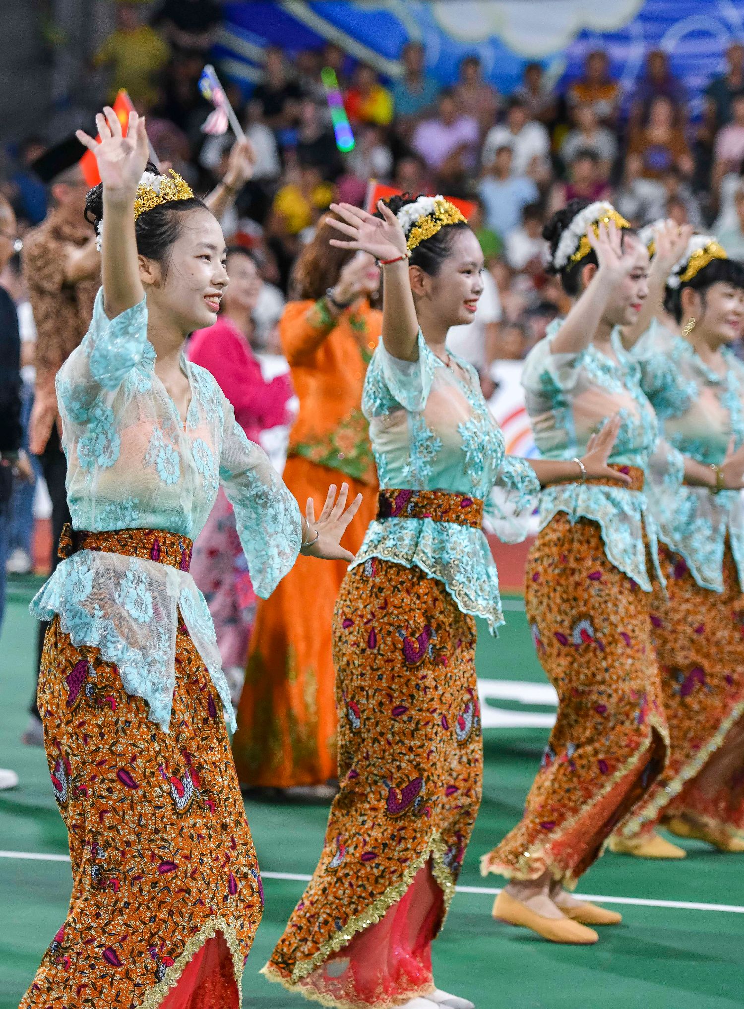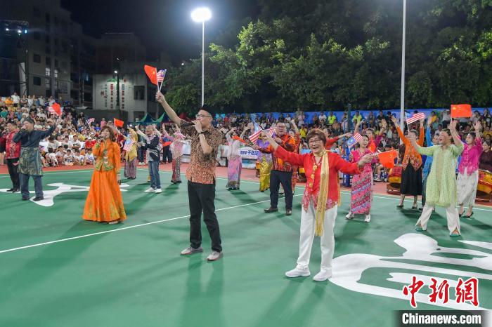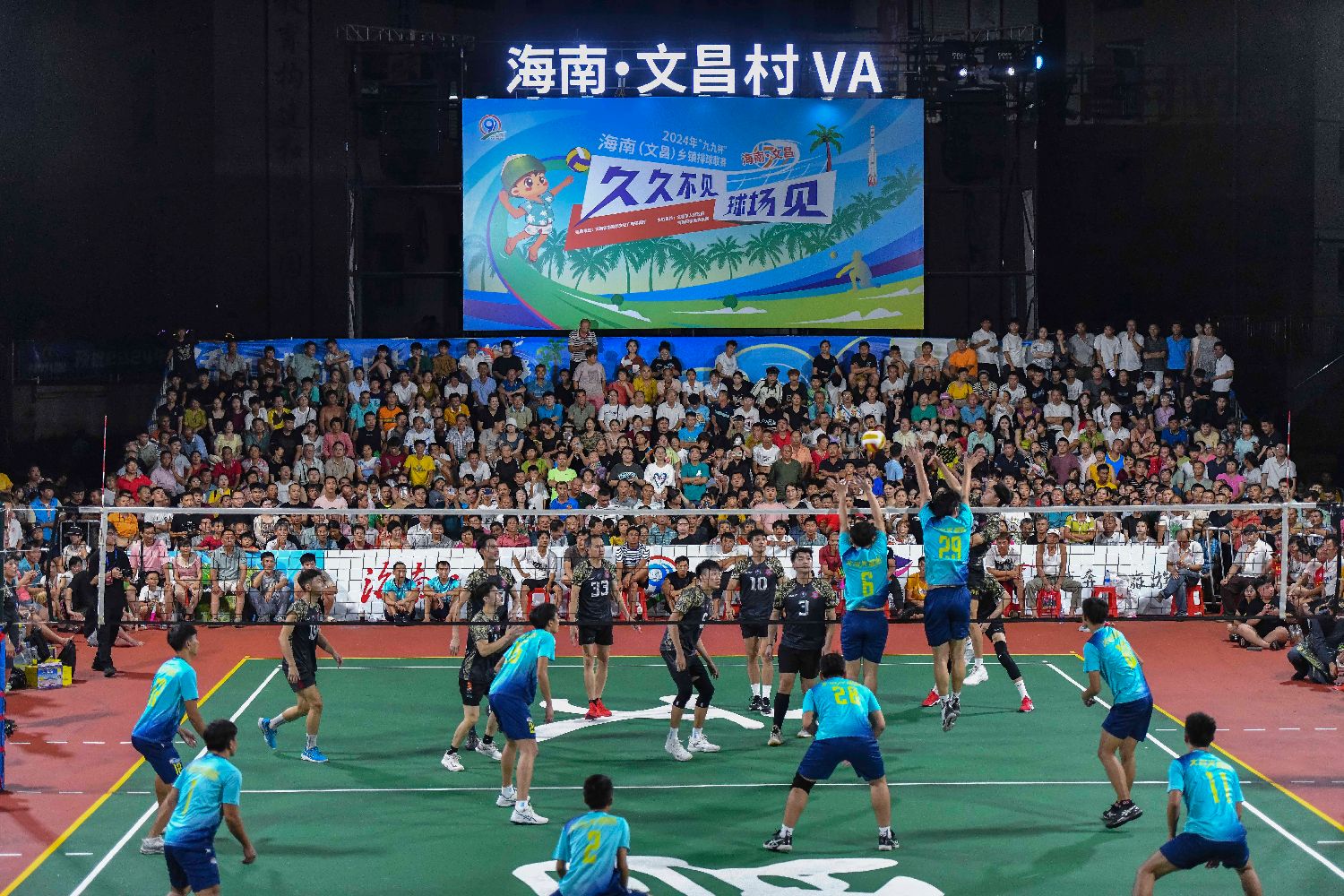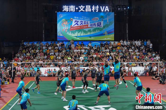 7月13日,2024年“九九杯”海南(文昌)乡镇排球联赛(即海南“村VA”)铺前站,由文昌火箭队与马来西亚华侨排球队为现场观众送上一场“南洋风”排球友谊赛。经过激烈角逐,最终文昌火箭队3:1战胜马来西亚华侨排球队。海南“村VA”赛事自去年开赛以来,就受到海外华侨华人的关注。此次马来西亚华侨排球队派出13名优秀队员。图为比赛前,马来西亚风情歌舞表演。中新社