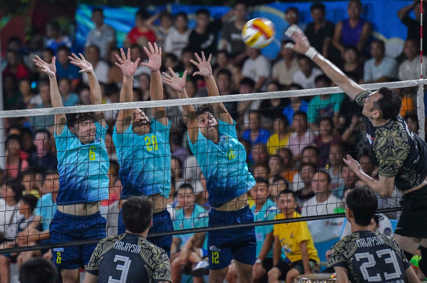 7月13日,一名马来西亚华侨排球队队员(黑)跃身扣杀。中新社