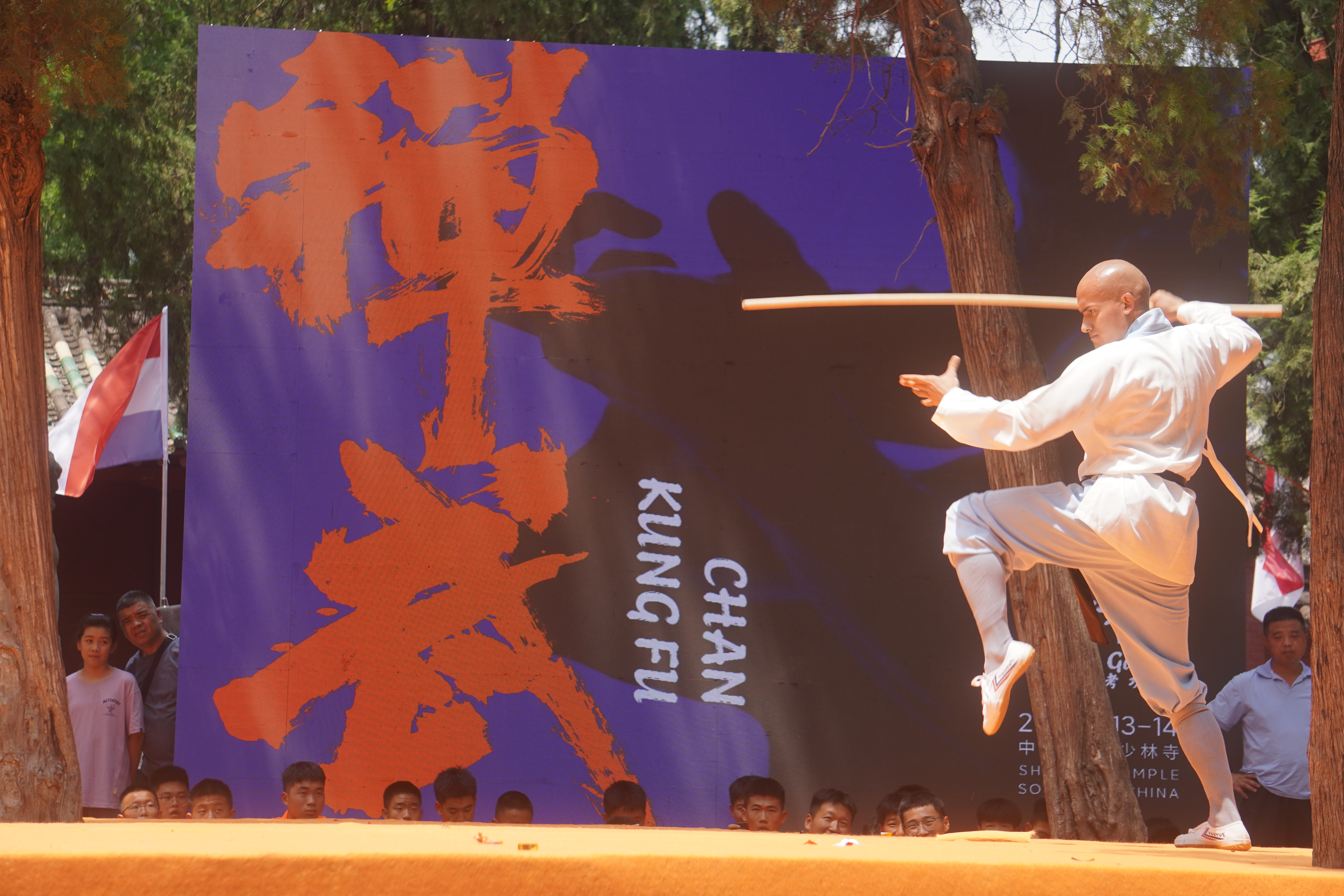 7月13日,少林功夫展演在嵩山少林寺山门前举行,众多海外习练少林功夫者向公众展示少林长拳、罗汉拳、猛虎拳,少林刀、棍、剑等少林拳法、少林兵器的习练成果。图为海外习练少林功夫者展示少林棍。中新社