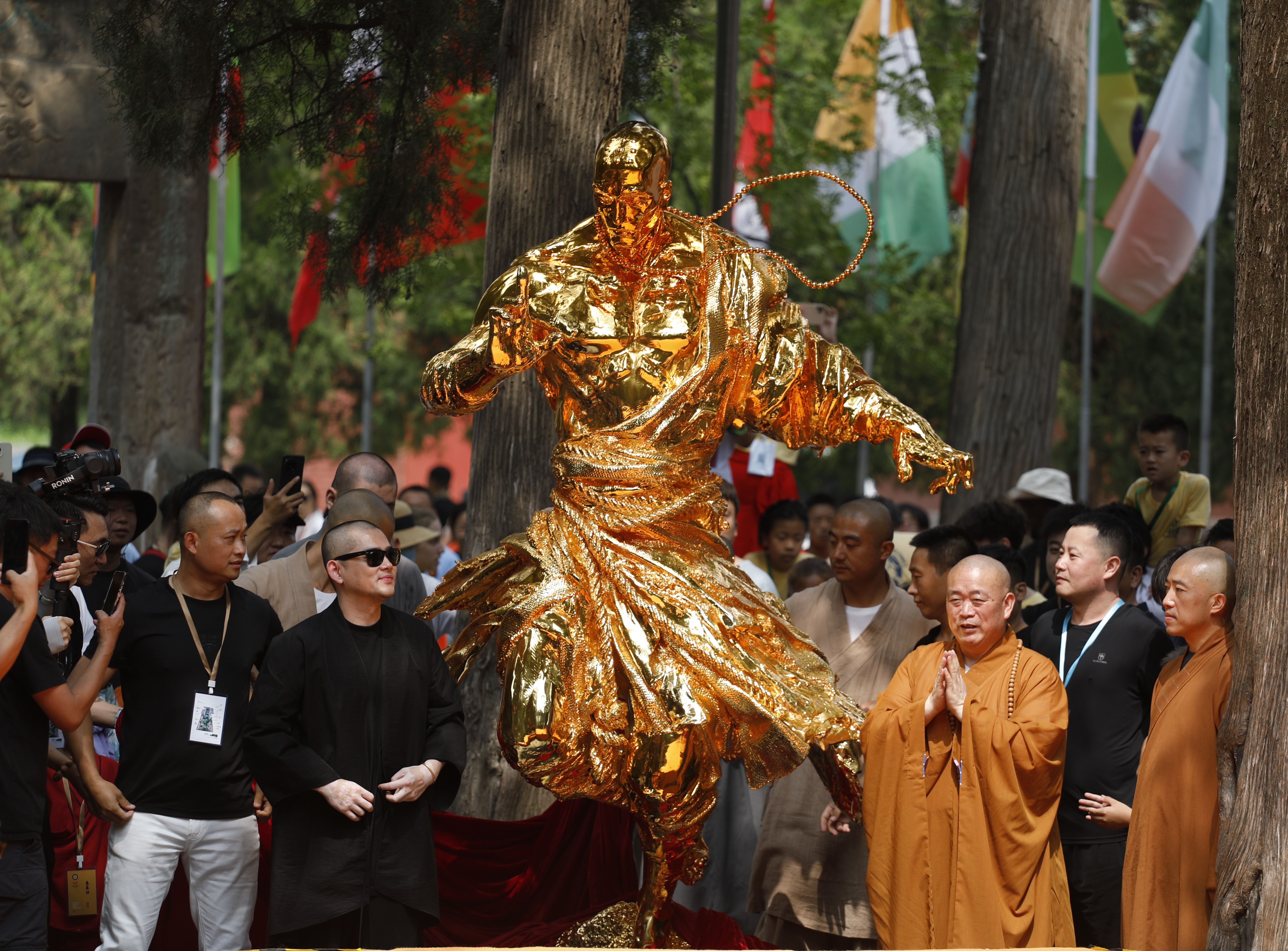 7月13日,雕塑家任哲(左二戴墨镜者)向少林寺捐赠雕塑作品。中新社