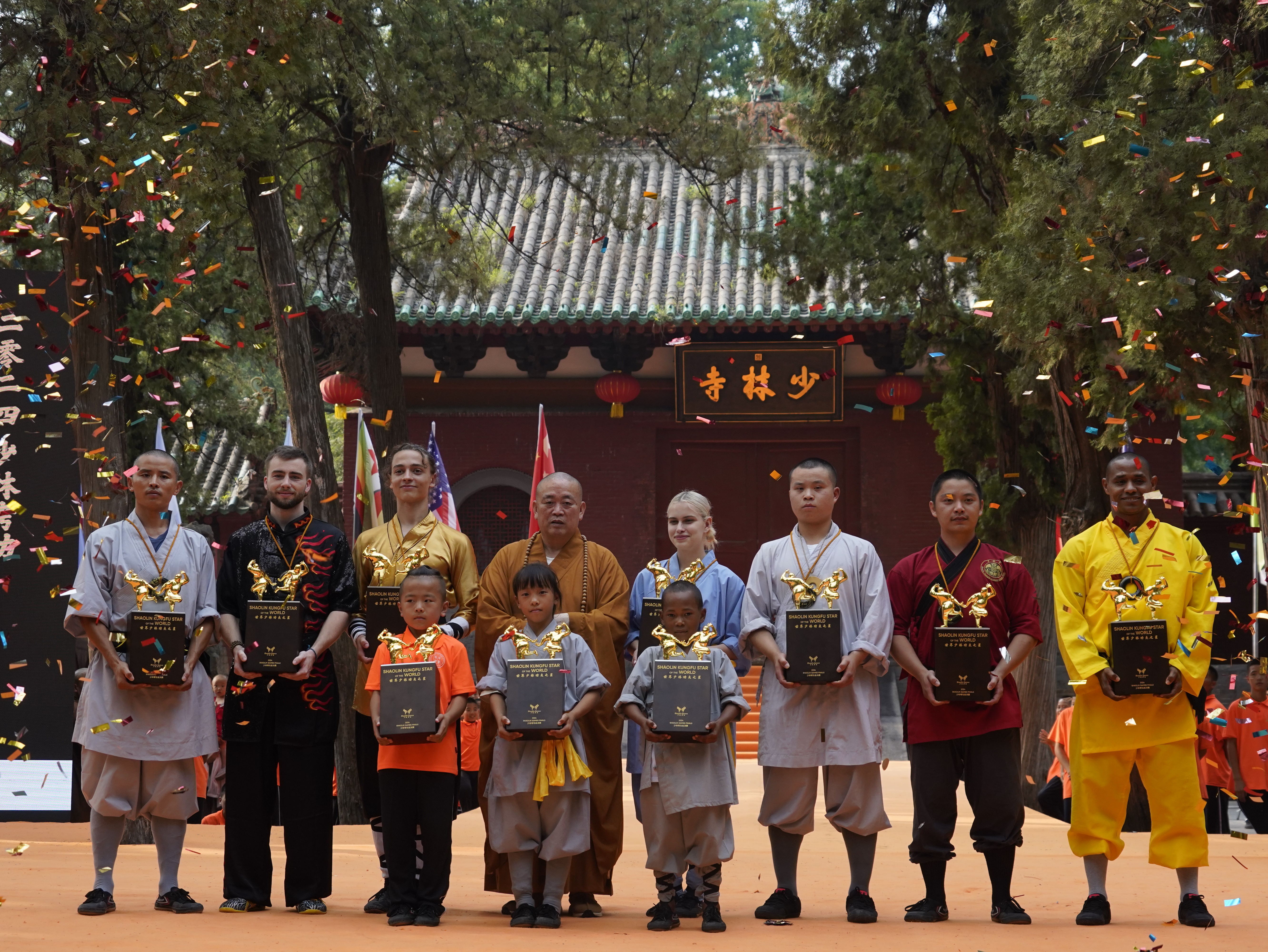 7月14日,少林寺方丈释永信(后排左四)与“2024年世界少林功夫之星”获得者合影。中新社