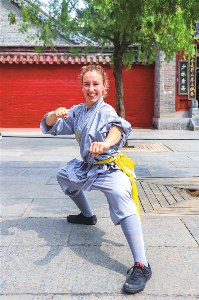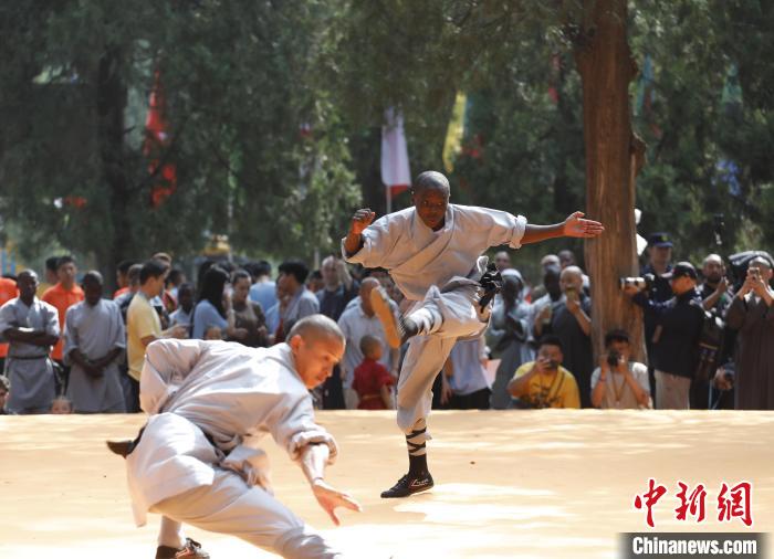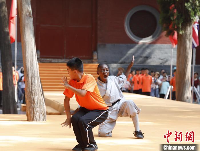 7月13日,海外习练少林功夫者展示少林拳法。中新社