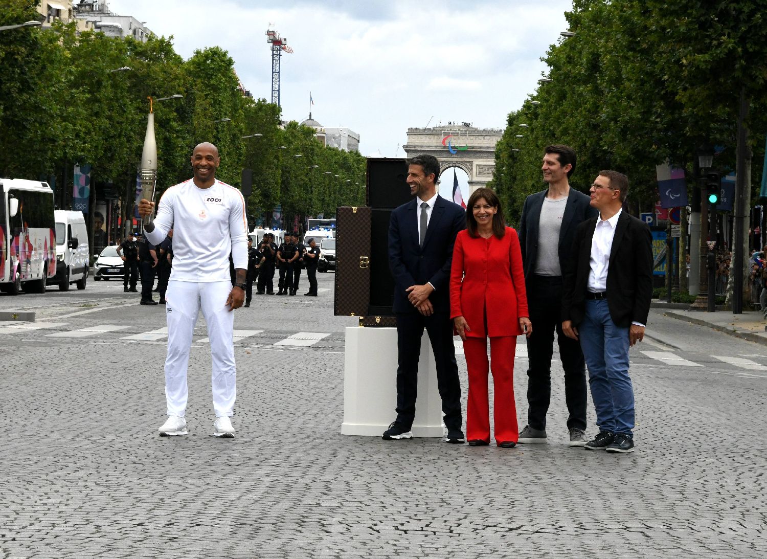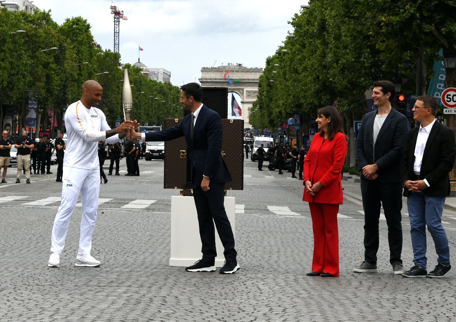 当地时间7月14日是法国国庆日,当日,2024年巴黎奥运会火炬在巴黎开始为期两天的传递。图为在巴黎市长伊达尔戈(右三)等人的见证下,巴黎奥组委主席埃斯坦盖(左二)将火炬交给巴黎的第一位火炬手、法国著名足球明星蒂埃里·亨利(左一)。中新社