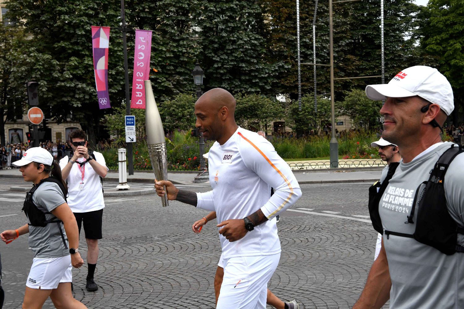 当地时间7月14日,蒂埃里·亨利在香榭丽舍大街进行火炬传递。中新社