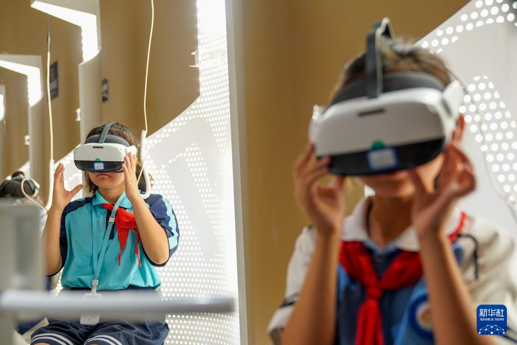 7月15日,在新疆库车市龟兹魏晋古墓遗址博物馆,参观者佩戴VR设备沉浸式探索博物馆。
