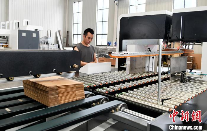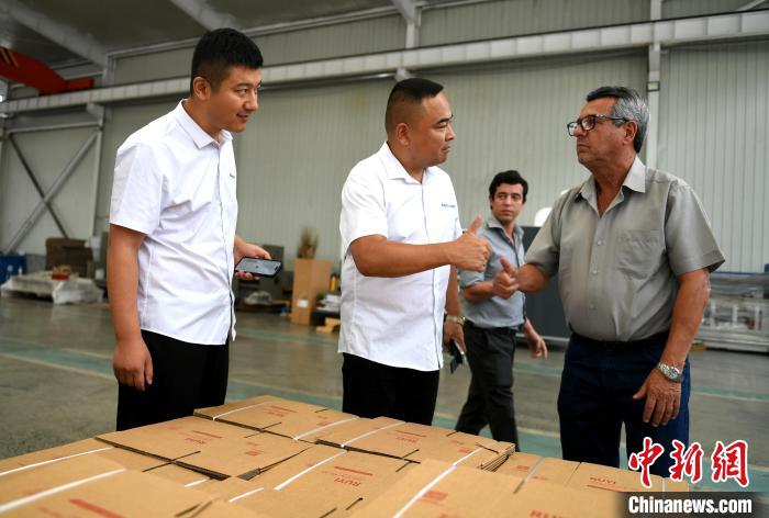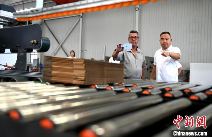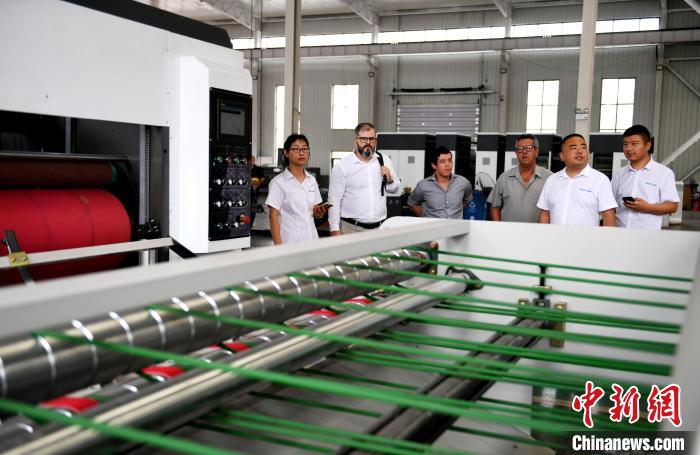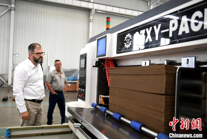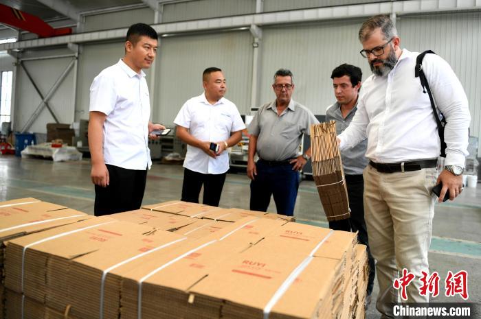 巴西客商在河北省衡水市阜城县码头镇一包装机械制造企业查看生产的纸箱。