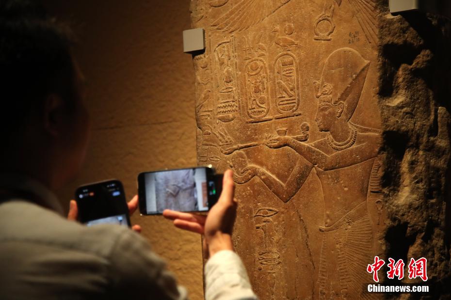 7月16日,在“法老的国度”展区,媒体人员在预览拍摄哈特谢普苏特跪像。新华社
