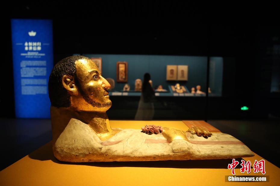 7月17日,在“萨卡拉的秘密”展区拍摄的萨卡拉考古遗址的“绿脸”彩绘人形棺。新华社