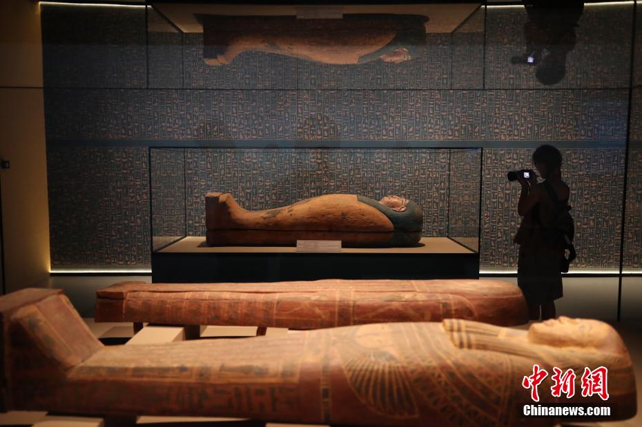 7月16日,在“法老的国度”展区,媒体人员在预览拍摄佩德阿蒙的彩绘人形棺。新华社
