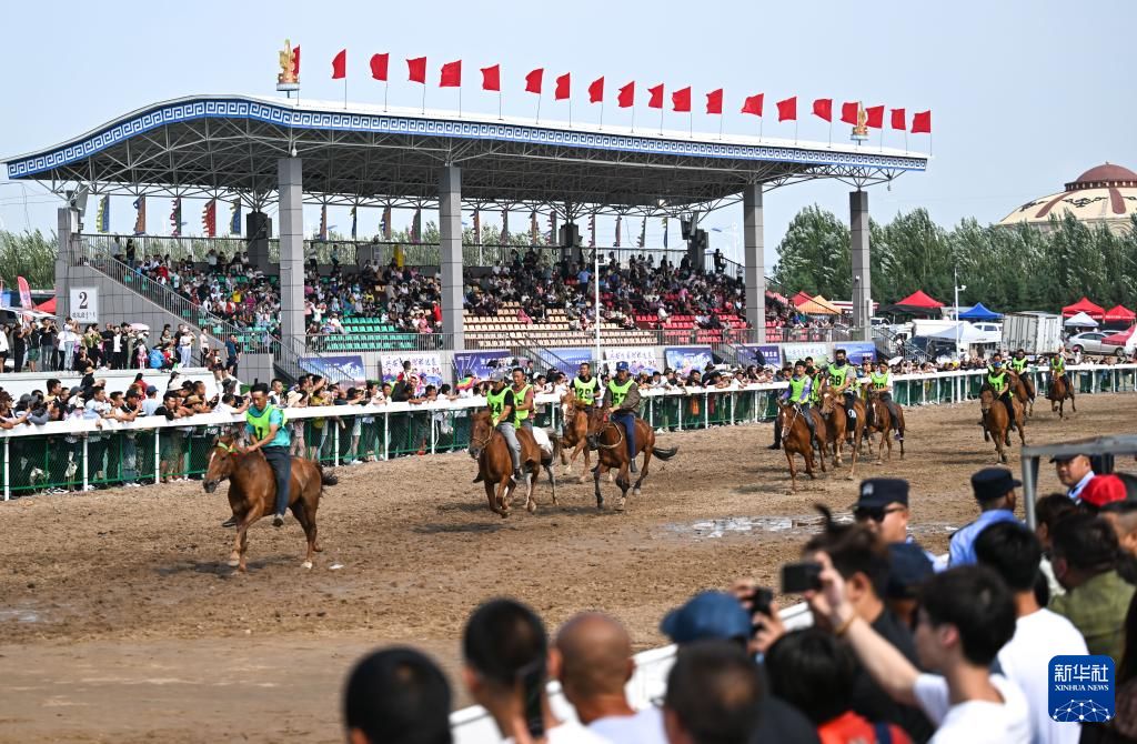 7月17日,选手在乌兰毛都苏木民族体育综合训练基地举行的赛马比赛中。新华社