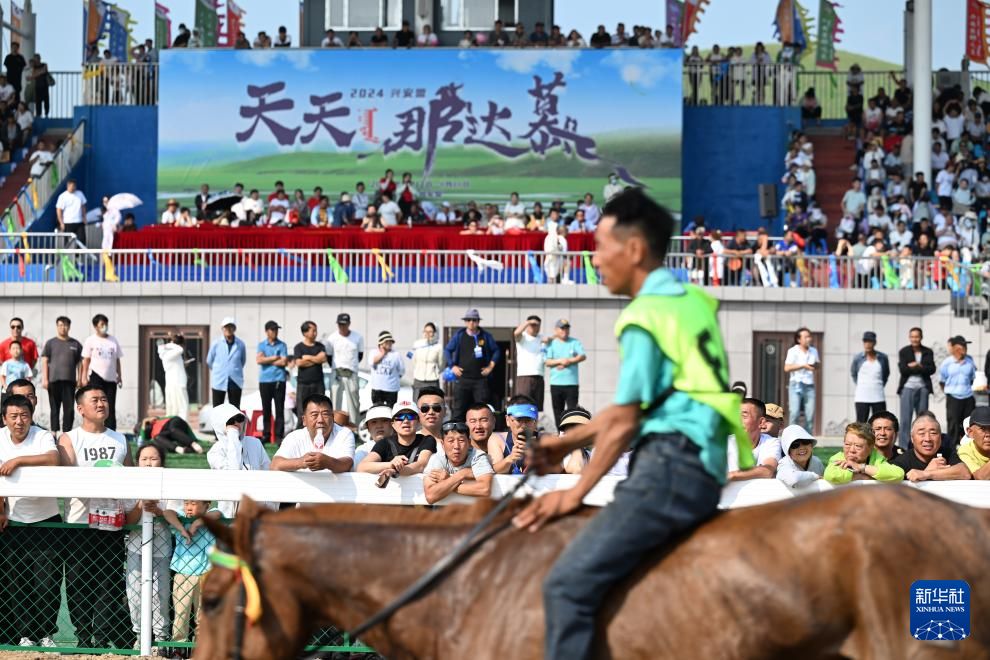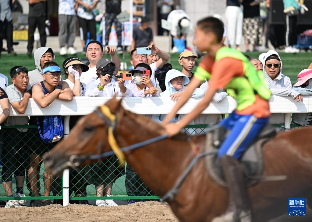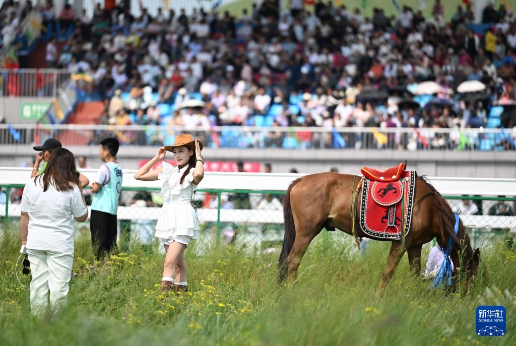 7月17日,游客在乌兰毛都苏木民族体育综合训练基地观看赛马比赛。新华社
