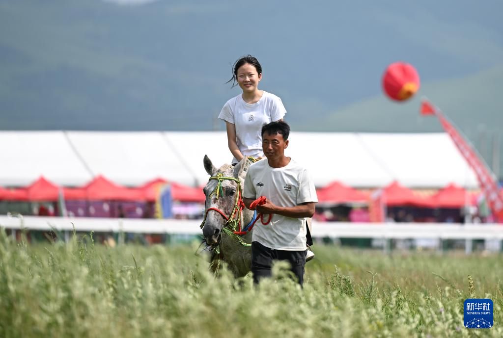 7月17日,游客(后)在乌兰毛都苏木民族体育综合训练基地体验骑马。新华社