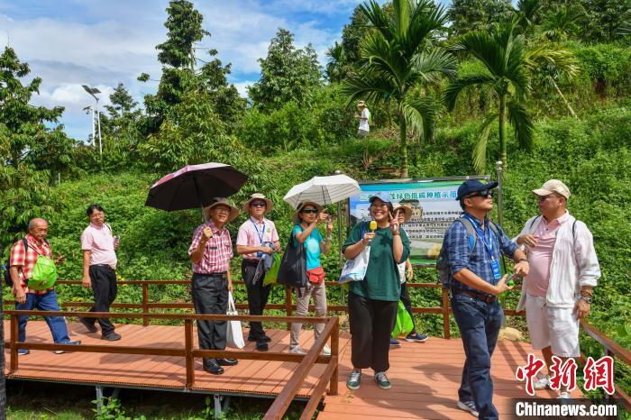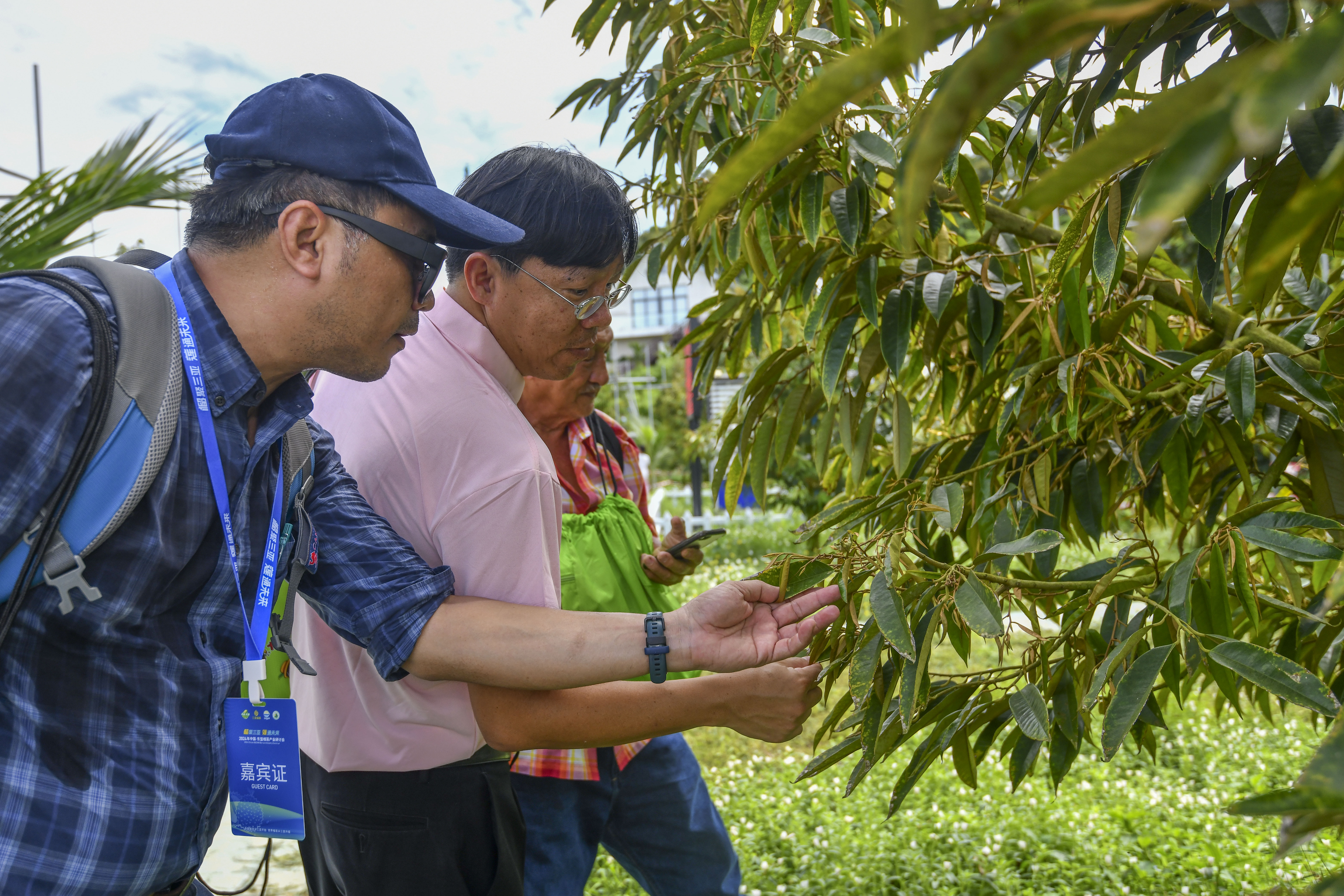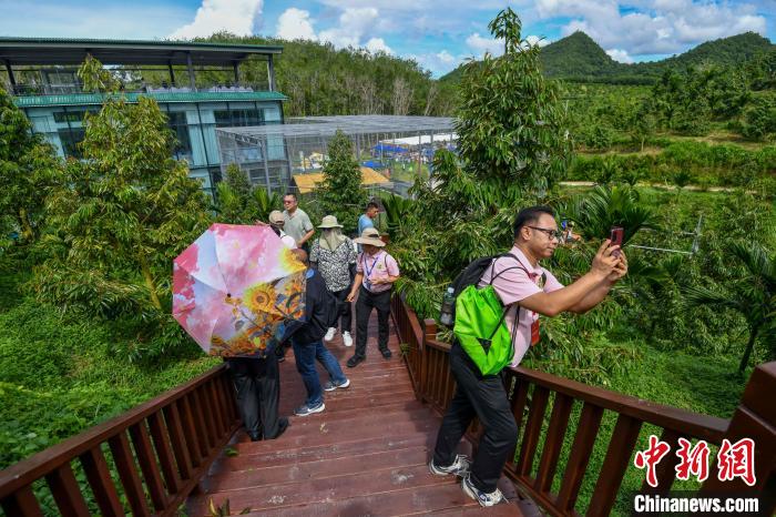 7月21日,嘉宾参观三亚市育才生态区的优旗大嘴鸟榴莲一号基地。中新网