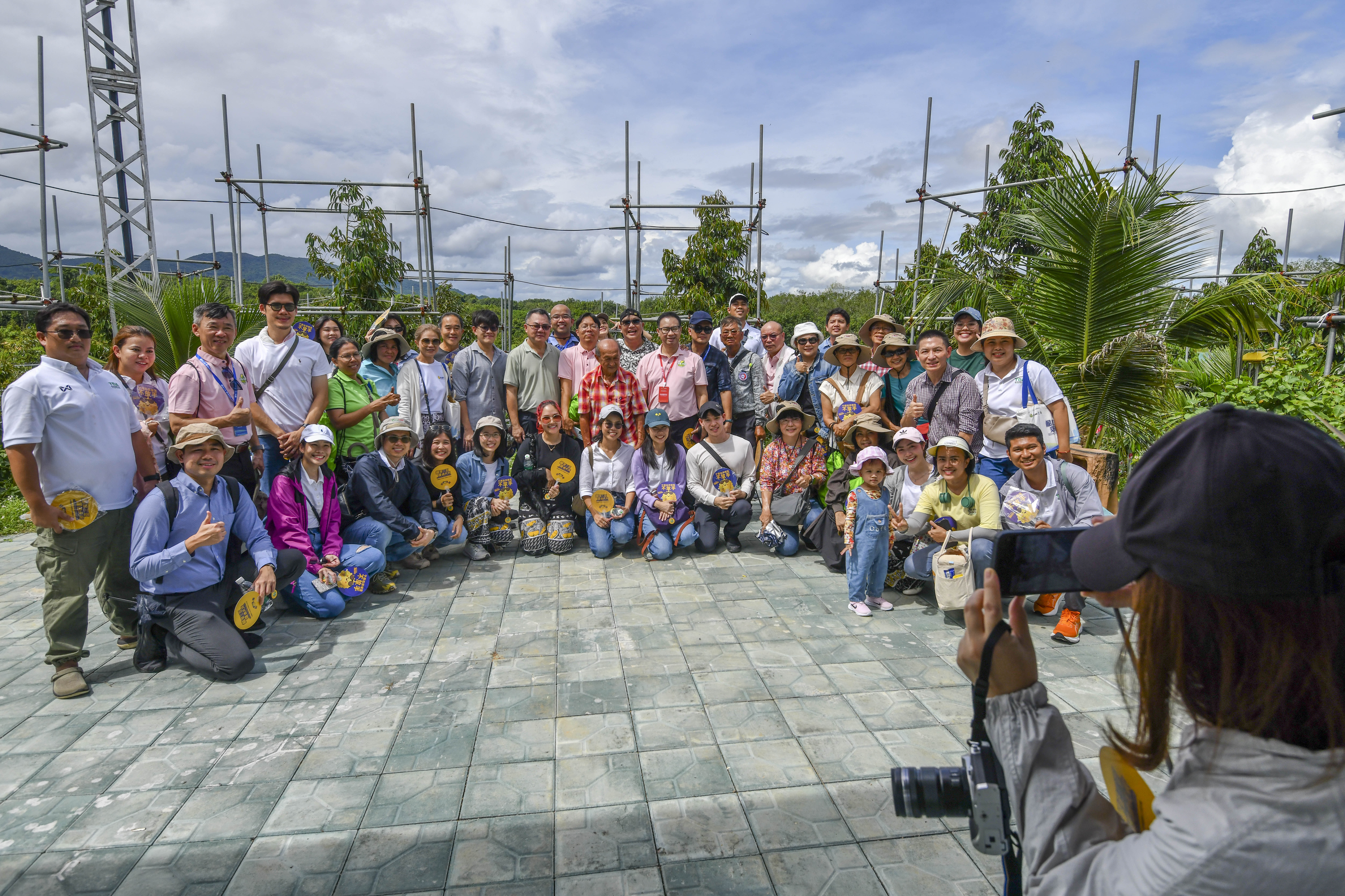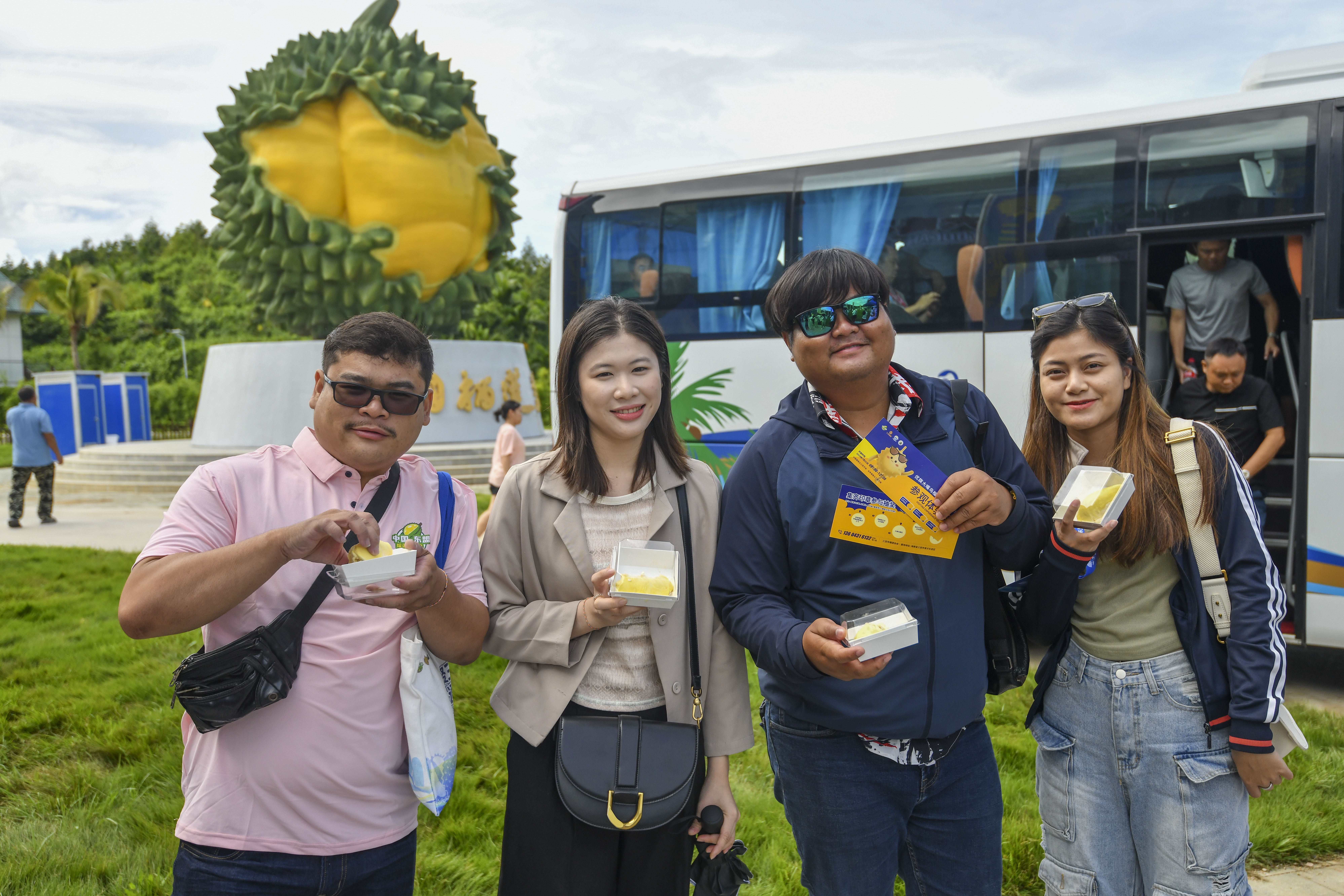 7月21日,来自泰国、马来西亚等国嘉宾参观三亚市育才生态区的优旗大嘴鸟榴莲一号基地并合影。中新社
