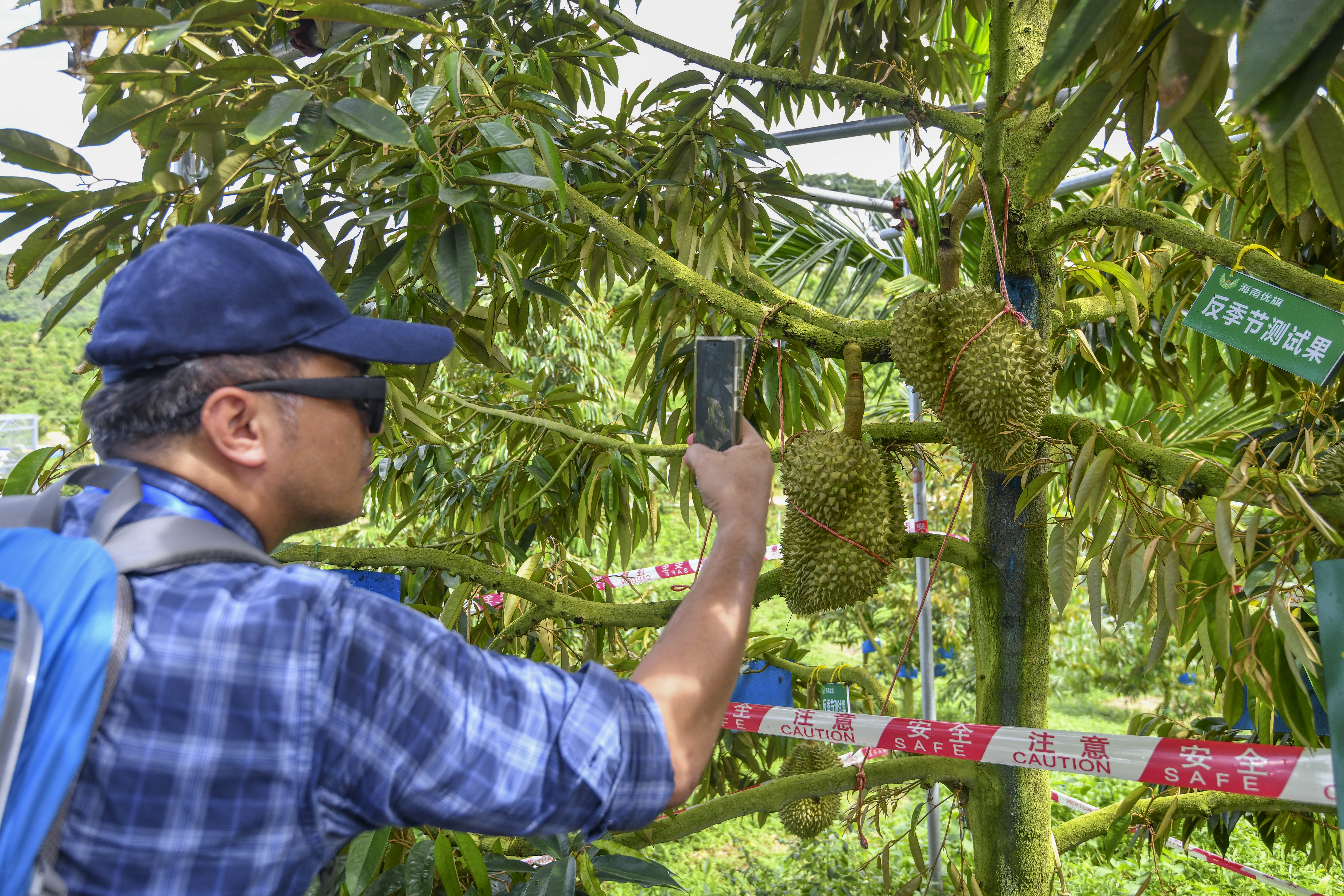 7月21日,嘉宾在三亚市育才生态区的优旗大嘴鸟榴莲一号基地参观,并用手机拍照。中新社