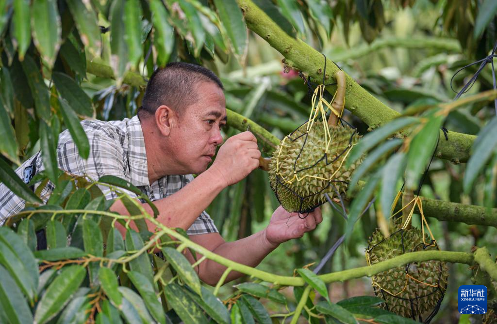 7月20日,工作人员在三亚市传福农业南喵果园榴莲基地查看榴莲成熟度。新华社