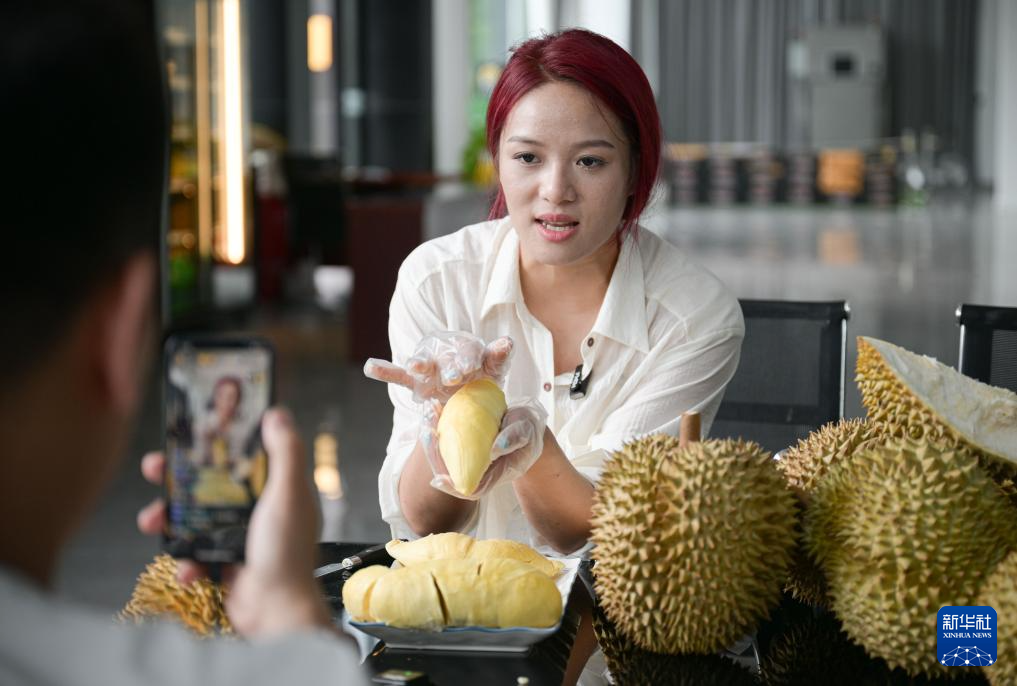 7月20日,在三亚市优旗大嘴鸟榴莲园一号基地,网络主播在视频直播中介绍国产榴莲。新华社