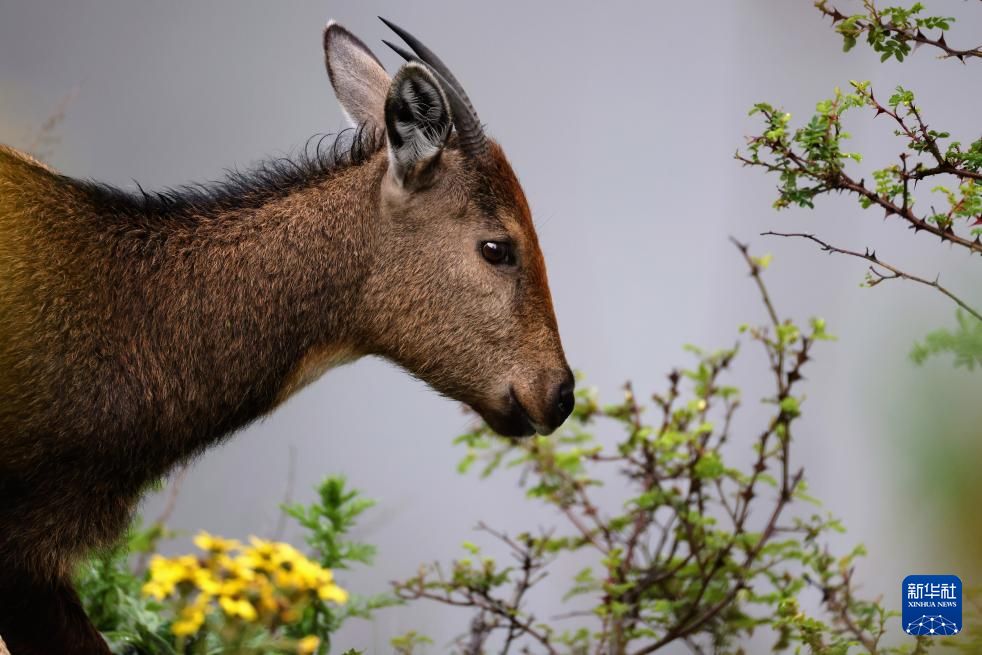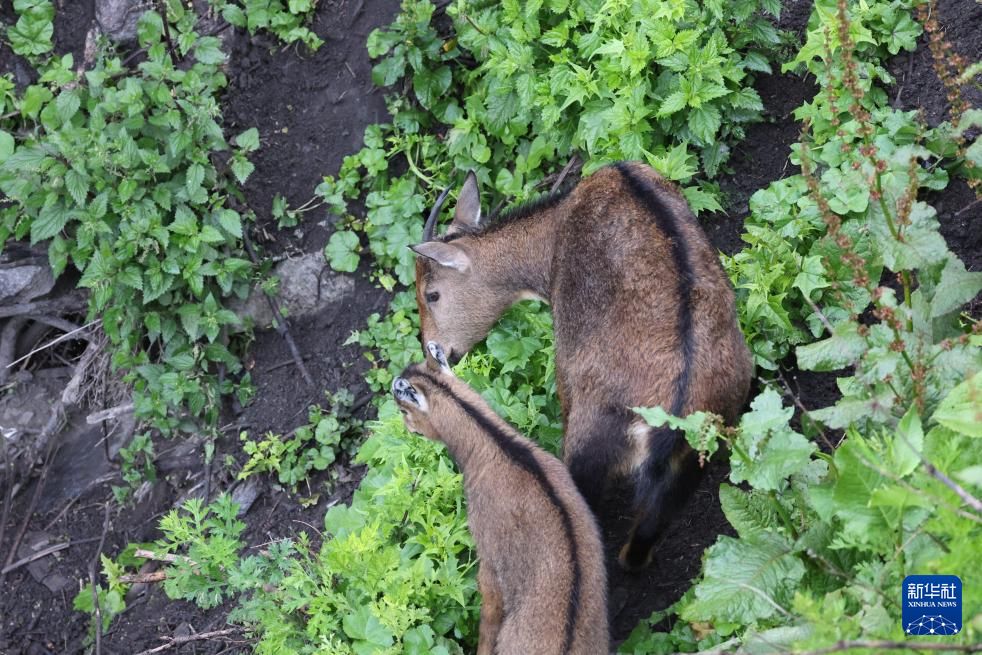 7月23日,雌性喜马拉雅斑羚带领幼崽觅食。